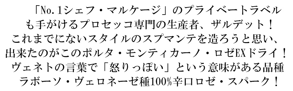 【商品名】ポルタ モンティカーノ ロゼ エクストラ ドライ(ザルデット社) スプマンテ ロゼ 重厚ボトル Alc.11.0% 【英名】Porta Monticano Rose Extra Dry Zardetto Vino Spumante Rose 【商品説明】イタリア辛口スパークリング・ロゼ愛好家大注目!こだわりイタリア高級辛口スプマンテ・ロゼ愛好家大注目!イタリア・NO.1シェフ!マルケージのプライヴェートラベルも手掛けるプロセッコ専門の生産者、プロセッコの凄腕、イタリア星つきレストラン御用達の人気生産者ザルデットからヴェネト州トレヴィーゾ近郊で栽培された土着品種ラボーソ・ヴェロネーゼ種100%辛口・ロゼ・スパークリングワイン!豊富な酸を持つラボーソと、エクストラ・ドライ仕立てが生み出す絶妙なバランス感!美しい淡いロゼカラー!きめ細かな泡立ち、マラスカチェリーやスグリのチャーミングなアロマ!土着品種で造る、爽やかなロゼ・スプマンテ!味わいの決め手は、エクストラ ドライ仕立て、辛口スパークリング!このポルタ・モンティカーノ・ロゼ・エクストラ・ドライ(ザルデット社)はヴェネト州トレヴィーゾ近郊で栽培された土着品種ラボーソ ヴェロネーゼを使っています!「ラボーソ」とはヴェネトの言葉で「怒りっぽい」という意味があります!ラボーソは酸がしっかりとある品種のため、残糖がやや高めのエクストラ・ ドライに仕上げています!収穫し葡萄は短時間果皮とともにマセラシオンを行い、美しい淡いロゼカラーに仕上げます!長年プロセッコを造り続けてきたファビオは、これまでにないスタイルのスプマンテを造ろうと思い、出来たのがこのワインです!ラボーソは酸がしっかりとある品種のため、残糖がやや高めのエクストラ・ドライに仕上げています!晩熟な品種なので、10月初旬に収穫します!短時間果皮とともにマセラシオンを行い、美しい淡いロゼカラーにします!きめ細かな泡立ち、マラスカチェリーやスグリのチャーミングなアロマが広がります!口に含むと集約があり、とてもエレガントで、心地よい酸味が爽やかです!極上スペシャル・キュヴェの大人気ロゼ・スプマンテが素晴らしくきれいなエチケットで正規品で限定入荷! 【タイプ】ロゼ・辛口 泡 スパークリング 【生産年】NV 【生産者】ザルデット社 【生産地】イタリア/ヴェネト/ヴィノ スプマンテ ロゼ 【品種/セパージュ アッサンブラージュ】ラボーソ・ヴェロネーゼ種100% 【内容量】750ml 【注意文】4935919058513 【JANコード】0219002012359