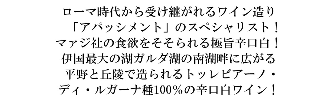 【商品名】ルナティオ 2021 年 マァジ社 ルガーナDOC 白 辛口 【英名】Lunatio 2021 MASI DOC Lugana 【商品説明】イタリア・ヴェネト産フルーティ&アロマティック辛口白ワイン愛好家大注目!北イタリア、ミラノとヴェネツィアの中間にあるガルダ湖はイタリア最大の湖!その南湖畔に広がる平野と丘陵で造られるトッレビアーノ・ディ・ルガーナ(トゥルビアーナ)種100%の辛口白ワイン!酸とミネラルが堅固なワインで、フレッシュで、味わい深く、後口に塩っぽさを感じさせるミネラルが心地よく、食欲をそそります!造り手は、ガンベロ・ロッソ誌2018年版において「ワイナリー・オブ・ザ・イヤー」を受賞(これはイタリア全土2485あるワイナリーからたったひとつ選ばれる大変名誉ある賞)!最高のクオリティを持ち、ヴァルポリチェッラとアマローネの名を世界的に著名なものとしたことと、50年間に渡る功績を認められ満を持しての受賞となったマァジ社!ヒュー・ジョンソン氏に「芳しく、滑らかで、コクとフレーバーをたっぷりもつもの」と言わしめた、ガルダ湖の南で産するトレッビアーノ・ディ・ルガーナ種100%で造られる超人気辛口白ワイン!ずばりローマ時代から受け継がれるワイン造り「アパッシメント」のスペシャリスト、マァジ社の高級辛口白ワイン「ルナティオ」!トッレビアーノ・ディ・ルガーナ(トゥルビアーナ)100%使用!ソフトプレスの後、マストを冷却!清澄後、選別酵母を加え、14℃~19℃の温度管理下で発酵されます!ワインはシュールリーでステンレスタンクで約4ヶ月熟成で造られる究極辛口白ワイン!パイナップルやシトラスフルーツの香りが味わいまで続きます!いきいきした酸味のフルーティな辛口で、後味にはほんのりとオイリー感が残る極旨辛口白ワイン!マァジ社が誇る大人気ルナティオが待望入荷!アペリティフに最適、前菜、魚料理とともに。 【タイプ】白・辛口 【生産年】2021 【生産者】マァジ社 【生産地】イタリア/ヴェネト/ルガーナDOC 【品種/セパージュ アッサンブラージュ】ディ・ルガーナ種100% 【内容量】750ml 【JANコード】0219002012526