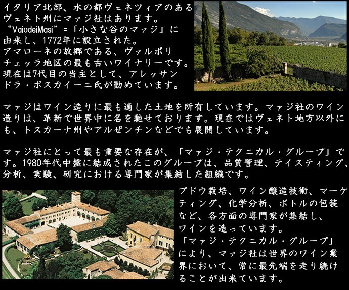 頑なにヴェネト地方固有のブドウ品種を用い、また伝統的な「アパッシメント製法」にこだわり、さらにヴェネト古来に存在した醸造技術「リパッソ」を現代に復活させたマァジ。ヴェネトの伝統と革新が織り成す匠の技が、それまでのヴェネトのワインの評価を根底から変革することになる「スーパー・ヴェネシアン」と「アマローネ」という傑作の数々を生み出した。的確な選択とそして何よりも独創的な技術が、この決して大きいとは言えないワイナリーをヴェローナワインの試金石と言われるまでにした。