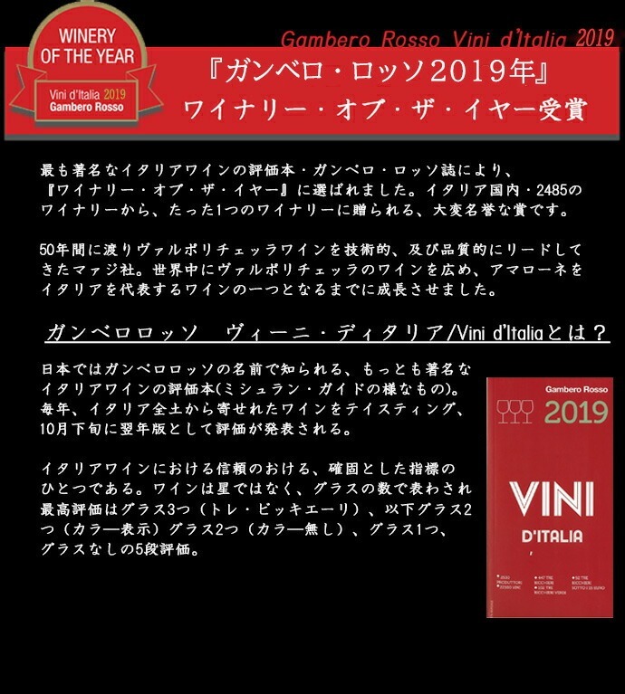 「ガンベロ・ロッソ創刊当初から掲載されているワイナリーでもあるマァジ社は、50年間に渡りヴァルポリチェッラワインにとって技術的、品質的なベンチマークでありました。マァジ社は世界中でヴァルポリチェッラエリアのワインを成功させ、そのエリアを代表するワイン、アマローネをイタリアの大使にさせたワイナリーです。それだけではなく、ガルガニャーゴの名を一つのブランドとし、アマローネとヴァルポリチェッラのワインを世界中で有名にしました。」とマスターエディターであるマルコ・サベッリコ氏がコメントを述べました。