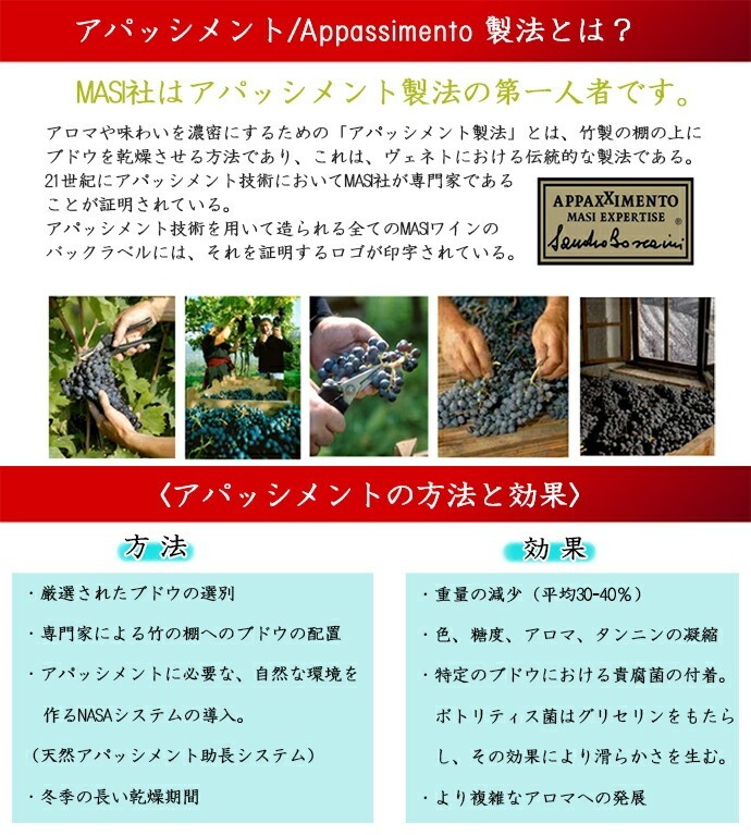 「ダブルファーメンテーション(二重発酵)」という古来のリパッソ製法をマァジが復活させ、1964年に初めて醸造されたワイン。最初に全3種の土地固有種ブドウを一次発酵させ、そのワイン(75%)を、同じ全3種を約6週間半乾燥させた陰干しブドウ(25%)に注ぎ入れ二次発酵を行う(15日/18~20℃)。すぐにマロラクティック発酵が行われ、この過程によって、ワインに新しい香りが生まれ、アルコールと色素、柔らかいタンニンが豊かになる。熟成は全体の2/3を90HLのスラヴォニアオーク樽で、残りの1/3を600Lのアリエとスラヴォニアオークの新樽で最低18ヶ月行う。その後最低3ヶ月瓶内熟成。