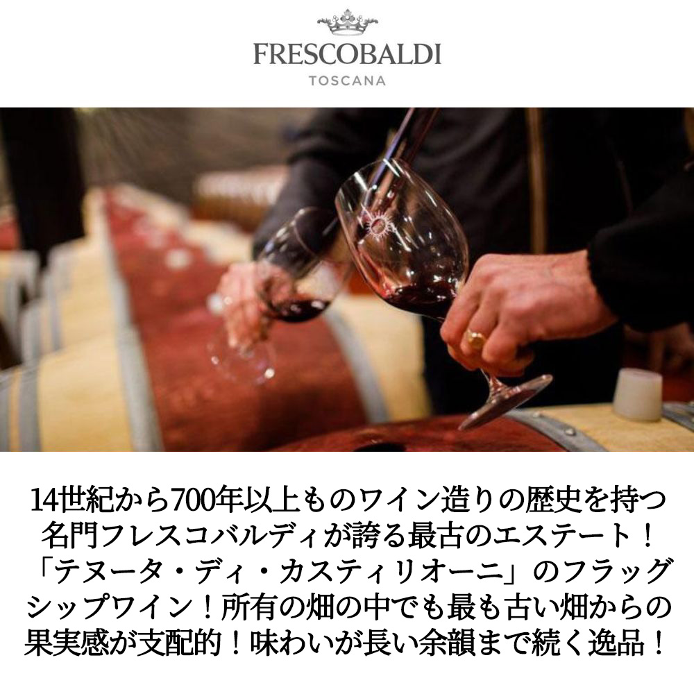 【商品説明】イタリア辛口赤ワイン愛好家大注目!トスカーナファン大注目!名門フレスコバルディが誇る最古のエステート「テヌータ・ディ・カスティリオーニ」のフラッグシップワイン! 造り手は14世紀から700年以上ものワイン造りの歴史を持つ名家マルケージ・デ・フレスコバルディ!“ルーチェ”や“カステル・ジョコンド”、この“フレスコバルディ・ディ・カスティリオーニ”など、トスカーナに9つの個性豊かな有名ワイナリーを所有!世界中から愛されるワイン造りを続ける名門フレスコバルディ家が11世紀から所有している歴史的エステート!コッリ・フォレンティーニ地区で、フィレンツェの南西20Kmにある、ヴァル・ディ・ペサに位置!513haの広さがあり、その内、152haでブドウ栽培を行う「テヌータ・ディ・カスティリオーニ」の看板ワイン!究極テヌータ・フレスコバルディ・ディ・カスティリオーニ! フレスコバルディ家所有の畑の中でも最も古い畑からブドウ、国際品種であるカベルネ・ソーヴィニョン50%、メルロー30%、カベルネ・フラン10%にサンジョヴェーゼ10%を小樽にて12ヶ月熟成、瓶内で2ヶ月熟成でリリースされる究極フルボディ辛口赤ワイン! 2018VTでジェームス・サックリング驚異91点高評価!凝縮した紫のきらめきのあるルビーレッドの色調と輝く透明感!香りは、チェリー、スグリ、イチゴや青いカリフォルニアのプラムを感じさせる果実が支配的!これに加え、シナモン、胡椒、ナツメグ、ローストしたココア、コーヒー、へーゼルナッツ等のスパイシーさ!味わいには暖かみと心地よい酸味に支えられた新鮮さがあり、控え目なタンニンの滑らかさはきめが細かく、エレガント!爽やかで果実味のある心地よい味わいが、長い余韻まで続く究極フルボディ辛口赤ワイン! フレスコバルディの中でも非常に人気のある傑作トスカーナが正規代理店輸入品で限定で少量入荷!