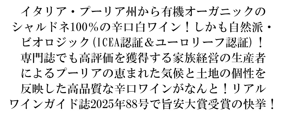 エコシステマ シャルドネ ビオロジコ 2023 カンティーネ パオロレオ元詰 自然派 12.5% リアルワインガイド誌2025年88号で旨安大賞受賞