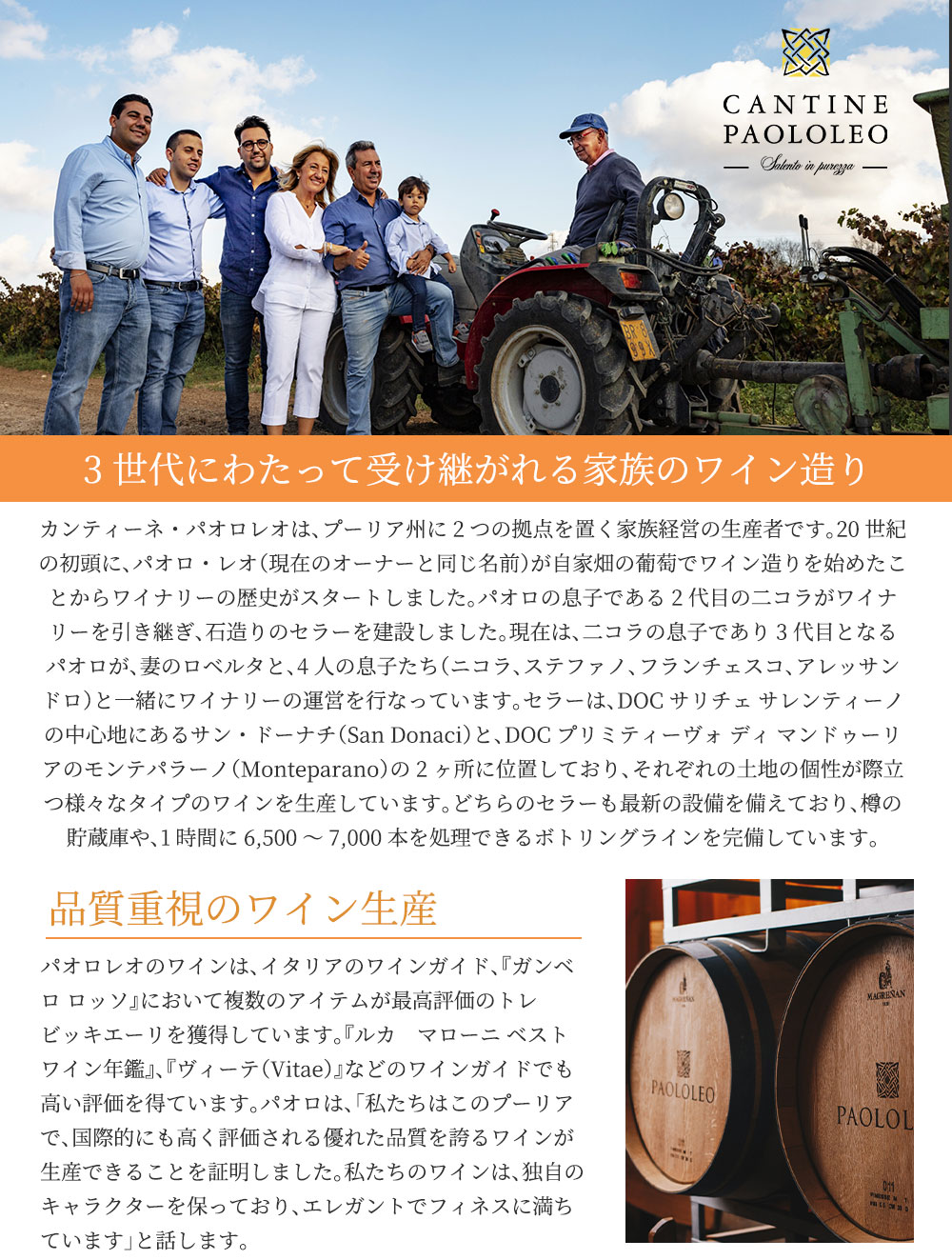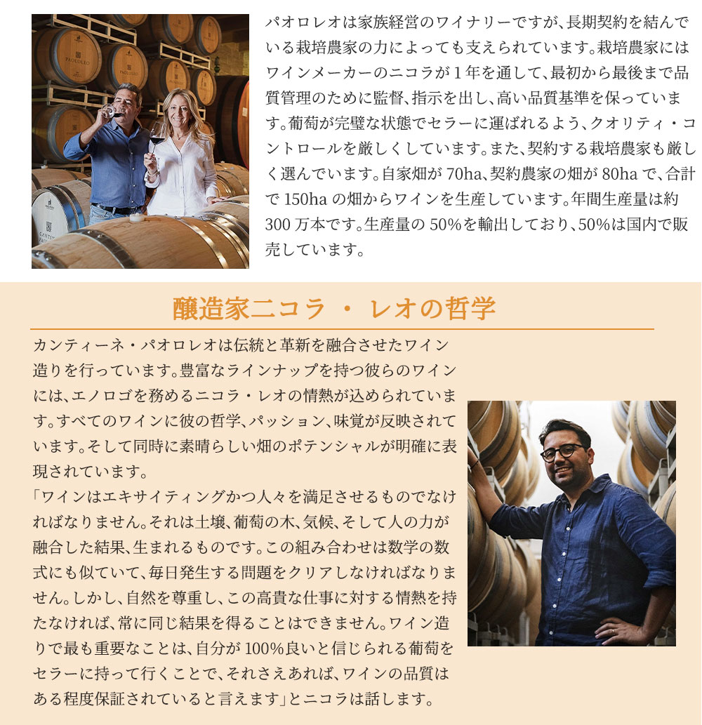 【商品名】エコシステマ シャルドネ ビオロジコ 2023 カンティーネ パオロレオ元詰 自然派 12.5% リアルワインガイド誌2025年88号で旨安大賞受賞 【英名】Ecosistema Chardonnay Biologico 2023 PAOLOLEO IGP PUGLIA Chardonnay BIOLOGICO 【商品説明】イタリア・プーリア州から有機オーガニックのシャルドネ100%の辛口白ワイン!しかも自然派・ビオロジック(ICEA認証&ユーロリーフ認証)のシャルドネ100%!しかも専門誌でも高評価を獲得する家族経営の生産者によるプーリアの恵まれた気候と土地の個性を反映した高品質な辛口ワインがなんと!リアルワインガイド誌2025年88号で旨安大賞受賞の快挙!注目絶賛コメントは『ワイン名に「ビオ」と入っているとちょっと懐疑的な気持ちになることもあ るが、このワインは大いにオススメです! シャルドネだけど、てっきりソーヴィニヨン・ブランかと思うほどの爽やかな石けん香。その香りにも液体にもミネラルによるツヤ感がある。爽やかだけど複雑で充実した味わいが、とろんとした液体に乗りながらすみずみまで広がっていく。これは美味しいです。クリアでピュア、そして自然体。ブドウ力の強さもヒシッと感じます。89+~90点獲得 飲みごろ、今~2045年』とコメント!造り手のカンティーネ パオロレオは、プーリア州に2つの拠点を置く家族経営の生産者です。セラーは、DOC サリチェ サレンティーノの中心地にあるサンドーナチ(San Donaci)と、DOCプリミティーヴォ ディ マンドゥーリアのモンテパラーノ(Monteparano)の2ヶ所に位置しており、それぞれの土地の個性が際立つ様々なタイプのワインを生産しています。現当主3代目パオロ レオ氏で醸造責任者・エノログ=二コラ レオ氏。パオロレオのワインは、イタリアのワインガイド、『ガンベロ・ロッソ』において複数のアイテムが最高評価のトレ・ビッキエーリを獲得しています。『ルカ・マローニ ベストワイン年鑑』、『ヴィーテ(Vitae)』などのワインガイドでも高い評価を得ています。パオロは、「私たちはこのプーリアで、国際的にも高く評価される優れた品質を誇るワインが生産できることを証明しました。私たちのワインは、独自のキャラクターを保っており、エレガントでフィネスに満ちています」とコメント。このエコシステマ・シャルドネ・ビオロジコ[2023]年・カンティーネ・パオロレオ元詰はプーリアの恵まれた気候と土地の個性を反映した高品質な有機栽培のシャルドネで造ります。(ICEA認証。(栽培農家にはエノログのニコラが年間を通し、品質管理のために監督、指示を出し、高い品質基準を保っている。)サレントの南部に位置するブリンディシのサン・ドーナチの畑で有機栽培されたシャルドネによるオーガニックワインです。葡萄樹は垣根仕立て、剪定はギヨー、栽植密度は4,500本/haです。8月下旬に収穫します。除梗し、やわらかくプレスします。15度の低温に温度コントロールされたステンレスタンクで10日間発酵させます。ステンレスタンクで4ヶ月熟成後、ボトルで1ヶ月寝かせます。グリーンを帯びた輝きのある淡い麦わら色、フレッシュで、熟した桃や洋梨の甘くフルーティなアロマに柑橘系の要素が混ざります。口当たりは繊細、心地よい酸があり、非常に調和のとれた味わいです。温暖な地域でありながら酸とミネラルを感じさせる見事な白ワインが限定で正規品の素晴らしい状態で少量入荷! 【タイプ】白 辛口 【生産年】2023 【生産者】カンティーネ・パオロレオ 【生産地】イタリア/プーリア/I.G.P.プーリア シャルドネ100% 【品種/セパージュ アッサンブラージュ】シャルドネ100% 【内容量】750ml 【JANコード】※こちらの商品はラベルの材質上、浮き、シワ等が起こりやすくなっております。あらかじめご了承の上、ご購入いただけますよう、どうぞ宜しくお願い申し上げます。 【JANコード】0219002012946