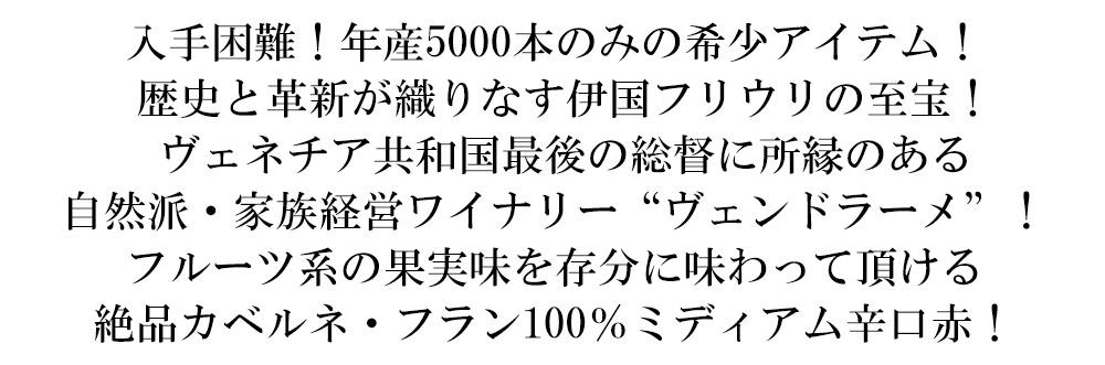 【商品名】ヴェンドラーメ カベルネ フラン 2023 ヴェンドラーメ ヴィーニス デル ドージェ 自然派 サステナブル農法&ヴィーガン認証 DOCフリウリ 【英名】Vendrame Cabernet Franc 2023 VENDRAME VIGNIS DEL DOGE S.S. DOC Friuli 【商品説明】イタリア赤ワイン愛好家大注目!フリウリファン大注目!カベルネ・フラン愛好家必飲!年産わずか5000本のみの希少アイテム!歴史と革新が織りなすフリウリの至宝!ヴェネチア共和国最後の総督に所縁のある自然派・家族経営ワイナリー“ヴェンドラーメ”!造り手のヴェンドラーメは1997年設立の家族経営ワイナリー!北はアルプス、南はアドリア海に囲まれた豊かな渓谷の中心部にあるフリウリ・グラーヴェDOCエリアに位置し、自社畑のブドウのみを使用しワイン造りを行っています!この土地はかつて16世紀から17世紀にかけて共和制海洋国家として栄華を誇ったヴェネツィア共和国最後の総督、ルドヴィコ・マニン氏の避暑地(ヴィラ・マニン)でした!1600年代のヴィラ・マニンは「VIGNIS」と呼ばれる広大なブドウ畑(現在はヴェンドラーメ家の所有)とヴィラの一部にはワイナリーがあり、重要なワイン生産地でした!醸造家兼オーナーのジーノ・ヴェンドラーメ氏は”Assoenologi F.V.G 委員会”(イタリアの醸造家協会)のメンバーでもあり、歴史に情熱を注ぎ、それをワイン造りにも繋げたいという思いがあります!ワイン造りの全ての工程をジーノ氏が細やかにチェックし、高品質なワインを生み出しています!50haの畑で、ピノ・グリージョ、ソーヴィニヨン、フリウラーノなどの白ワイン用ブドウと、レフォスコ、メルロー、カベルネ・フランなどの赤ワイン用ブドウを栽培しています!ワインは全てヴィーガン認証を取得し、動物由来の成分を一切含んでいません!「ヴェンドラーメ・ヴィーニス・デル・ドージェ」は、家族の苗字と「VIGNIS」という古い地名を組み合わせたもの、ラベルデザインはかつてのヴィラ・マニンの美しい庭園地図を現代的にアレンジしたもので、この地の歴史がワイナリーのアイデンティティーの一部を形成しています!この「ヴェンドラーメ・カベルネ・フラン」は、年産5000本のみの限定生産品!フリウリD.O.C.の石灰岩、砂利土壌からの厳選カベルネ・フラン100%(自然派サステナブル農法)をステンレスタンクにてMLF醗酵!ステンレスタンク(澱とともに)8~12ヶ月熟成!さらに2ヶ月の瓶熟を経てリリース!チャーミングな赤系果実と青ピーマン、白コショウ、スミレの美しいアロマ!シルキーなタンニンと力強くもエレガントなボディが品のよさを演出するワイン!イタリア・フリウリからのフルーツ系の果実味を存分に味わって頂ける絶品カベルネ・フランが限定で少量入荷! 【タイプ】赤・辛口 【テイスト】ミディアムボディ 【生産年】2023 【生産者】ヴェンドラーメ・ヴィーニス・デル・ドージェ 【生産地】イタリア/フリウリ ヴェネツィア・ジューリア/ フリウリ・グラーヴェ/DOCフリウリ 【品種/セパージュ アッサンブラージュ】カベルネ・フラン100% 【内容量】750ml 【JANコード】0219002013141