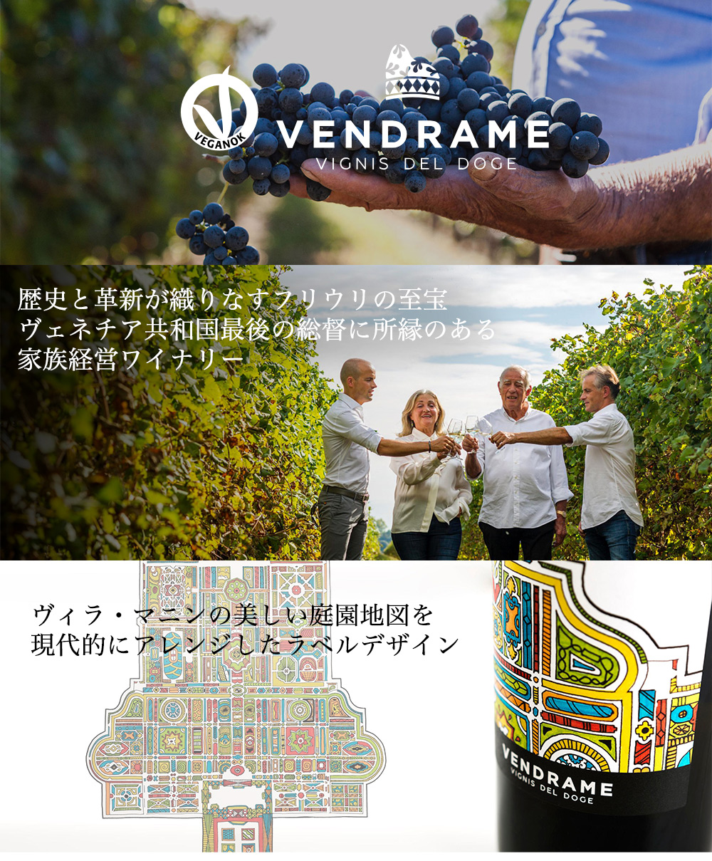この土地はかつて16世紀から17世紀にかけて共和制海洋国家として栄華を誇ったヴェネツィア共和国最後の総督、ルドヴィコ・マニン氏の避暑地(ヴィラ・マニン)でした。 1600年代のヴィラ・マニンは「VIGNIS」と呼ばれる広大なブドウ畑(現在はヴェンドラーメ家の所有)とヴィラの一部にはワイナリーがあり、重要なワイン生産地でした。 ブランド名「ヴェンドラーメ・ヴィーニス・デル・ドージェ」は、家族の苗字と「VIGNIS」という古い地名を組み合わせたもの、 ラベルデザインはかつてのヴィラ・マニンの美しい庭園地図を現代的にアレンジしたもので、この地の歴史がワイナリーのアイデンティティーの一部を形成しています。