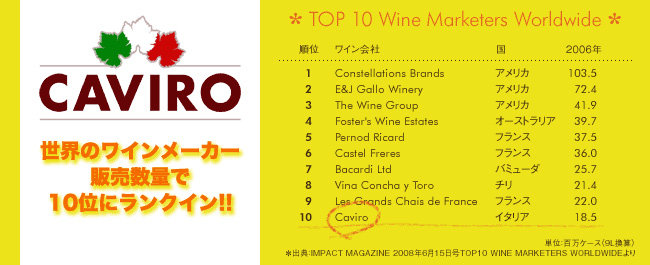 イタリアのNo. 1ワイン※のタヴェルネッロは、イタリアの家庭で30年以上愛され続けている非常にポピュラーな商品です。タヴェルネッロの人気はイタリアのみならず、ドイツやイギリスなどの欧州諸国をはじめ、中国、日本、ロシアなどの全世界的に広まっており、世界で最も人気のあるワイン・ブランドの第5位となっています※※。※イタリアで売り上げNo.1のワイン:Iriインフォスキャン(インフォメーション・リソーシズ社)2010年度、包装品ベース、セルフサービス食料品店でのワインの総販売量 100平米※※出典はImpact Global News and Research for the Drinks Executive(インパクト — 飲料業界関係者のためのグローバル・ニュース/リサーチ)、2010年6月号