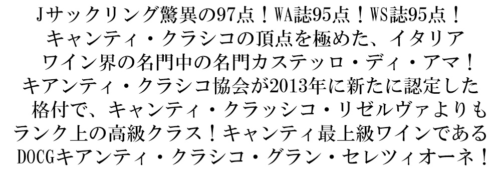 【商品名】カステッロ アマ キアンティ クラシコ グラン セレツィオーネ“サン ロレンツォ” 2019 カステッロ ディ アマ元詰 【英名】Chianti Classico Gran Selezione“San Lorenzo”[2019] Castello di Ama DOCG Chianti Classico Gran Selezione 【商品説明】イタリア・トスカーナ・フルボディ辛口赤ワイン愛好家大注目!キアンティ・クラッシコ・グラン・セレツィオーネDOCG愛好家大注目!キャンティ・クラッシコ・リゼルヴァの更に上を行く高級クラスとして「キアンティ・クラシコ協会」が2013年から新しく制定された高級DOCG規格で自社葡萄100%のみを使用し、リゼルヴァよりもさらに半年以上長い30ヶ月の熟成と言う厳しい規定になっているキャンティ・クラッシコ・グラン・セレツィオーネ!(単一畑の高品質なブドウのみ使用&約30ヶ月の長期熟成)!キャンティ・クラシコの頂点を極めた、イタリアワイン界の名門!ロバートパーカー5つ星生産者で、キャンティ・クラシコの名門カステッロ・ディ・アマ!マルコ・パランティ氏と妻のロレンツァ・セバスティ女史によって世界最高レベルのワイン造りを行っています!現在のオーナー兼醸造家であるマルコ氏は、長年キャンティ・クラシコ協会の会長を務め、キャンティ・クラシコの地位を復活させた、イタリアが誇る銘醸生産者!徹底した品質主義と「テロワールの表現」を哲学とし、これまで30年以上に渡りイタリアワインの最前線で活躍し続けています!マルコ氏は、キャンティ・クラシコが早く飲める安ワインという存在だった時代に、「5年経っても美味しく飲める=熟成するキャンティ・クラシコを造る」と目標を掲げました!収量を約50%に制限し、畑の特徴を活かすため、ブルゴーニュ的なクリュごとに収穫・醸造する方法を採用!彼が目指したのは、「キャンティ・クラシコ」のワインを造るのではなく、あくまで「カステッロ・ディ・アマ」のワインを造ること!キャンティ・クラシコの名に頼らず、自身の名に恥じない品質のワインを作ることを目指しました!このような努力により、ワインの品質は劇的に向上!アマのキャンティ・クラシコは世界的に高い評価を獲得!この「キアンティ・クラシコ・グラン・セレツィオーネ“サン・ロレンツォ”」はサンジョヴェーゼが80%にマルヴァジア・ネラとメルロを合わせて20%!マロラクティック発酵後、大樽で12ヶ月熟成!さらにリリースまで18~24ヶ月の瓶内熟成(計30~36ヶ月熟成)のフルボディ赤ワイン!この2019年でジェームス・サックリング驚異の97点でコメントは「香り高く、花、チェリー、ラズベリーが美しい。森の果実も。フルボディで、非常に繊細なタンニンがワインの長さを貫き、見事に溶け込んで口中に広がる。何分も続く。2025年以降はもっと良くなるが、すでに素晴らしい。」さらにワインアドヴォケイト誌95点で「2019年のキャンティ・クラシコ・グラン・セレツィオーネ・サン・ロレンツォは、エステート全体で選ばれた様々な場所から果実を採取しており、そのため、しばしばカステッロ・ディ・アマの最も代表的なワインとなる(より親しみやすい価格にもかかわらず)。このヴィンテージは特に興味深く、長期熟成のポテンシャルを示すタンニンの質はよりフォーマルで、柔らかく抽出された濃い果実味は他とは一線を画している。醸造家マルコ・パランティは2019年を2004年や2016年になぞらえており、最近の記憶では最高のヴィンテージである。ワインは部分的に新樽で熟成され、新樽の使用比率はヴィンテージのコンディションによって異なる。このエディションでは20%の新樽、ミディアムトースト、上質な粒が見られる。発酵中の温度は低めで、最初の2~3週間はポンプ・オーバーを多めに行い、その後は放置する。フレッシュなチェリーの果実味、ブラックベリー、スパイス、グリルしたハーブが現れる。」ワインスペクテーター誌堂々95点で「チェリー、ブラックベリー、スミレ、鉄のアロマとフレーバー。この赤は果実味とフィネスに重きを置いているが、野性的な地中海の潅木の要素もある。しっかりとした味わいで、濃密なタンニンと長い余韻がある。サンジョヴェーゼとメルロー。2026年から2045年がベスト。」グラスに注ぐと、綺麗に濃淡がかった鮮やかなルビー色に目を奪われます!フルーティーなイチゴとチェリーのアロマに、熟したプラムやブルーベリー、オリーブの香り、スミレになめし革、バルサミコ酢など多層的なアロマが特徴です!赤系果実の親しみやすい果実味が広がりますが、繊細なタンニンと相まって、チョコレートなど奥深い風味が感じられます!上質な酸が優しく溶け合い、余韻にかけては黒系果実、森や土のニュアンスがじんわりと持続!若々しくエレガントですが、熟成もしたくなる、滋味深い美味しさに満ちた1本!究極サン・ロレンツォ・キアンティ・クラッシコ・グラン・セレツィオーネが高評価ヴィンテージ[2019]年で限定少量入荷! 【タイプ】赤・辛口 【テイスト】フルボディ 【生産年】2019 【生産者】カステ