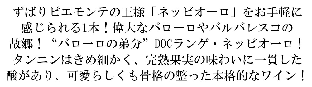 【商品名】ランゲ ネッビオーロ 2022 テッレ エ ボルギ DOCランゲ ネッビオーロ ネッビオーロ種100% アルコール度数13.5% 赤 辛口 フルボディ 【英名】Langhe Nebbiolo 2022 Terre e Borghi DOC Langhe Nebbiolo 【商品説明】イタリア・ピエモンテ辛口赤ワイン愛好家大注目!ランゲのネッビオーロ種100%熟成赤ワイン愛好家大注目!まじめで硬派なワインが多いこの地で造られ、ピエモンテらしい味わいを素直に感じるのにお財布に優しいワイン!ピエモンテの王様「ネッビオーロ」をお手軽に感じられる1本!偉大なバローロやバルバレスコの故郷!DOCランゲ・ネッビオーロ!赤いフルーツと優しいタンニンがバランスするランゲらしいスタイルのランゲ・ネッビオーロ!造り手は、ピエモンテで1964年に創業された歴史ある生産者が造る個性豊かでクラシカルなワインと、モダンで魅力的なプレゼンテーションを融合させたプロジェクト!大人気テッレ・エ・ボルギ!この「ランゲ・ネッビオーロ」は、炭酸カルシウムを含むマール土壌からの厳選ネッビオーロ種100%をステンレスタンク醗酵!オーク樽熟成6ヶ月(新樽比率15%、25HL、スラヴォニア産)で造られるフルボディ辛口赤ワイン!ラズベリーのアロマに加え、葉巻などの複雑な香り!タンニンはきめ細かく、完熟果実の味わいに一貫した酸があり、かわいらしくも骨格の整った本格的なワイン!まさに“バローロの弟分”というべき大人気ランゲ・ネッビオーロDOCが限定でびっくりプライスで少量入荷! 【タイプ】赤・辛口 【テイスト】フルボディ 【生産年】2022 【生産者】テッレ・エ・ボルギ 【生産地】イタリア/ピエモンテ/DOCランゲ 【品種/セパージュ アッサンブラージュ】ネッビオーロ種100% 【内容量】750ml 【注意文】4997678133061 【JANコード】0219002013899