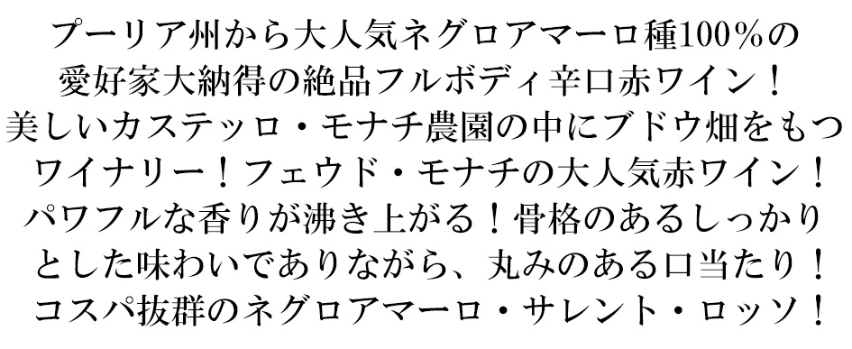 ネグロアマーロ サレント ロッソ 2022 フェウド モナチ サレントIGT ネグロアマーロ種100% 赤 辛口 フルボディ 750ml<br>Feudo Monaci Negroamaro Salento 2022 IGT Salento