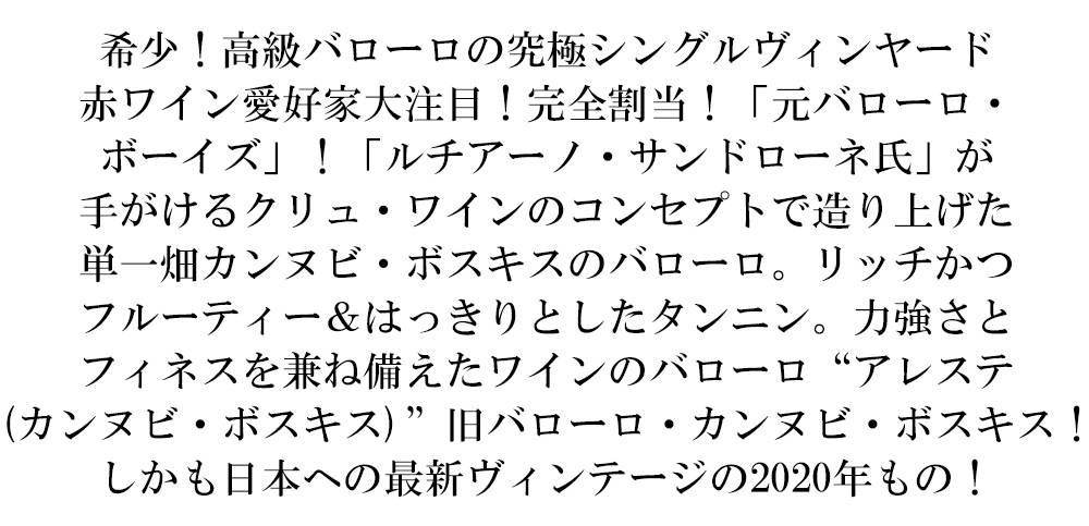 【商品名】バローロ アレステ(カンヌビ ボスキス) 2020 ルチアーノ サンドローネ元詰 DOCGバローロ 正規代理店輸入品 【英名】Barolo ALESTE (Cannubi Boschis) 2020 Sandrone Luciano DOCG Barolo 【商品説明】イタリア高級バローロ・フルボディ辛口赤ワイン愛好家大注目!究極シングルヴィンヤードの高級バローロ愛好家大注目!完全割当!「元バローロ・ボーイズ」と言えばこの人!「ルチアーノ・サンドローネ氏」が手がける旧バローロ・カンヌビ・ボスキス!2013年より2人の孫の名前を組み合わせた「アレステ」に名称変更されたカンヌビ・ボスキス!バローロ・ボーイズを牽引したマルク・デ・グラツィアと1982年に出会い、彼と共にバローロ新世代組のリーダー的存在として知られるようになった究極造り手!もちろんロバート・パーカー氏満点★★★★★5つ星生産者で、なんと!この「バローロ・アレステ(旧カンヌビ・ボスキス)」の2020年でワインアドヴォケイト誌驚異の96点獲得!絶賛コメントは『ルチアーノ・サンドローネ2020バローロ・アレステ(10,000本リリース)は、甘い土とアルコールを含んだチェリーが層を成している。熟した果実味から始まり、オークの要素、甘草、スパイス、バランスの取れた酸味へと変化していく。このワインは口当たりがとても美しく、余韻が長く、複雑味がある。アレステはバローロ村のカンヌビ・ボスキスの果実で造られる。これはフル・モンティ(「full amount」と「Monty Python」の Monty を組み合わせた表現)である。飲み頃、2026-2048年 97点』と高評価を獲得!ワインエンスージアスト誌でも驚異の95点獲得!絶賛コメントは『バラの花びらのオイル漬けとマレスカ・チェリーのアロマにお香のノートが重なり、グラスから漂う香りに魅了される。口に含むと、濃厚で濃く、ダークプラムと、ドライローリエと紅茶を思わせる甘いスパイスが口いっぱいに広がる。エレガントなタンニンと引き締まった酸味でフィニッシュ。飲み頃、今~2045年 95点』と大絶賛!ヴィノス誌でも驚異の95点獲得!絶賛コメントは『2020年のバローロ・アレステは上品でエレガントなワインで、抜栓直後から美味しく飲めるだろう。ブラックチェリー、プラム、モカ、リコリス、ダークスパイスが美しく共鳴する。ソフトでジューシー、絹のようなタンニンを持つ2020年のアレステは完全に魅力的だ。95点』とこれまた大絶賛!ワイン評論家のヒュー・ジョンソン氏をして「深みがあり、凝縮されたバローロ・カンヌービ・ボスキスとレ・ヴィーニェ」と大絶賛で★★★トリプルスター!極めつきはマット・クレイマー氏!「肉厚で力感がありながら柔らかいというスタイルのバローロを提唱するサンドローネ!そのバローロは名品のカンヌービ・ボスキスとレ・ヴィーニェどちらも濃厚で強く、深い味わいとともに明確なオークの風味がある。バローロに期待される長期熟成に耐える強い背骨と、早くから飲める近づきやすさという今日の需要とを結びつけようという試みは、まことに刺激的だが真摯なものであり、しかも成功を収めている。」と大絶賛の最高峰バローロ!バローロ村のVignane2区画、ノベッロ村のMeril、セッタラルンガ・ダルバ村のBaudana、カスティリョーネ・ファレット村のVilleroの計4つの畑、5区画のブドウの厳選ネッビオーロ100%をステンレスタンクでアルコール発酵を行ってすぐに500Lのフレンチオーク樽100%に移し、マロラクティック発酵と24ヵ月樽熟成!その後、更に18ヵ月間の瓶内熟成を経てリリース!蔵元からのバローロ“アレステ(カンヌビ・ボスキス)”[2020]年へのコメントは『兄弟であるル・ヴィーニュのボトリングと同様、この2020年のアレステ・バローロは、この若さで驚くほど寛大である。香りはすべて赤い果実と花で、土とミネラルのニュアンスもある。ル・ヴィーニェよりも力強さが感じられるが、非常にエレガントで早熟な寛大さは共通している。口に含むと、タンニンがより強調され、大量の果実味とフレッシュな酸味が感じられる。アレステ・バローロのこのボトリングは良い凝縮感と力強さを示しているが、兄弟であるル・ヴィーニュとは異なり、まとまるにはもう少し年月が必要だろう。このワインの見事な力強さは、エレガンスとバランスを損なうものではないが、イタリア語で 「ha una marcia in piu =エクストラ・ギアを装備」と言うように、もう一つの歯車を持っている。』 まさにクリュ・ワインのコンセプトで造り上げた単一畑カンヌビ・ボスキスのバローロ!リッチかつフルーティーで、はっきりとしたタンニンは骨格の一部となっています!力強さとフィネスを兼ね備えたワイン!人気で高評価ののヴィンテージ[2020]年が完全割当てで、しかも正規代理店輸入品で極少量入荷! 【タイプ】赤 辛口 【テイスト】フルボディ 【生産年】2020年 【生産者】ルチアーノ・サンドローネ元詰 【生産地】イタリア/ピエモンテ州/バローロ DOCGバローロ 【品種/セパージュ アッサンブラージュ】ネッビオーロ100% 【内容量】750ml 【JANコー
