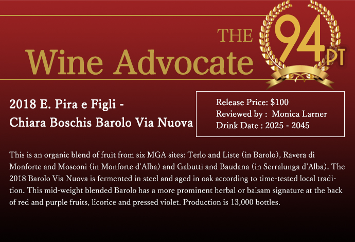 【商品名】バローロ・ヴィア・ヌオーヴァ・キアラ・ボスキス[2018]年・蔵出し品・6つのクリュの厳選ブドウをブレンド・フレンチオークのバリック樽+2000Lのオーク樽で24ヶ月熟成&瓶熟成=計36ヶ月熟成・エンリコ・ピラー・エ・フィグリ元詰・ジェームス・サックリング94点&ワインアドヴォケイト誌94点&アントニオ・ガッローニ94点・正規品【英名】Barolo Via Nuova Chiara Boschis 2018 Azienda Agricola E.Pira & Figli DOCG Barolo