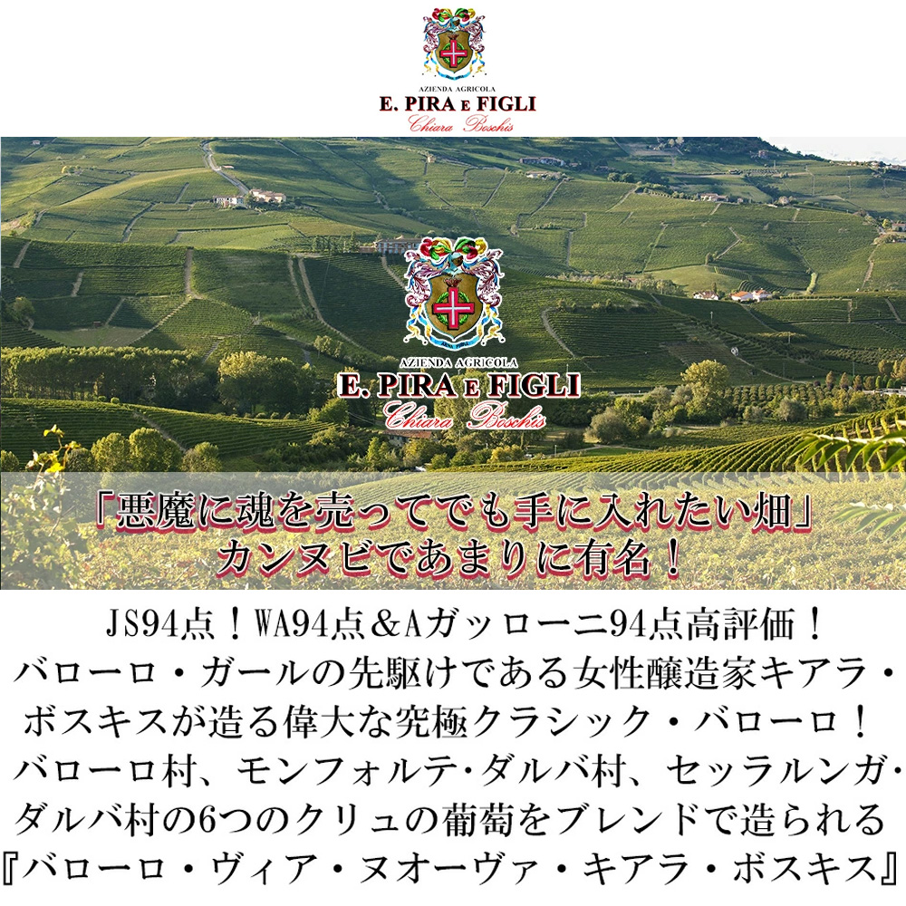 【商品説明】イタリア フルボディ辛口赤ワインファン大注目!高級バローロ愛好家垂涎!バローロ・ガールの先駆けである女性醸造家キアラ・ボスキスが造る偉大なクラシック・バローロ!「悪魔に魂を売ってでも手に入れたい畑」カンヌビであまりに有名!しかも発見された最古のバローロには、“カンヌービ1752”と記されていたというピラー社! 「良いワインは良いブドウから」という、畑での作業を重んじる栽培哲学をもって、バローロの伝統を新しい文脈で見事に表現する銘醸生産者エンリコ・ピラー・エ・フィグリ!輸入元様の説明は「1637年サヴォイア家に仕えていたサルデーニャ州出身の軍人ガスパル・ピラーに褒章としてバローロの土地が与えられた事からピラー社の歴史が始まります。1800年代末には、E.Pira&Figli(ピラー)社としてバローロの土地でワイン造りが始められました。かつてのオーナーであるルイージ・ピラー氏は伝統的なバローロの造り手で、伝統的な醸造方法を好み、破砕を足で行う等、いかなる技術の助けも得ることなくワイン生産を行っていました。ルイージ・ピラー氏を最後にピラー家の男系が途絶えると、ワインの伝統を守るため、ボスキス家にワイナリーを譲渡しました。ピラー社は当初から非常に高く評価されていましたが、新進気鋭のワインメーカーとして名を馳せていたキアラ・ボスキス女史が1980年にワイナリーを受け継いだ事で、さらに注目を集めまる事となりました。 キアラ女史は同じくピエモンテ州のラ・スピネッタ社のジョルジョ・リヴェッティ氏とも親交が深く「よいワインはよいブドウから」という共通の栽培哲学を持って畑での仕事を厳密に手作業で行っています。ピラー社のワインは、キアラ女史が栽培を手掛けているブドウのみを使って造られます。バローロD.O.C.G.エリアには、ブドウ栽培に最適な条件が揃った“Le.Grandi.Vigne”「偉大な畑」と呼ばれる畑があります。この「偉大な畑」というのは、いずれも小さな区画(畑)ですが、特別に日当たりがよく、急斜面で土壌構成もよいという好条件が揃っており、さらに特殊なミクロクリマがブドウにエレガントさを与え、上質のワインが生まれます。ピラー社の畑はいずれもこの「偉大な畑」に位置しています。 特にカンヌービは、「悪魔に魂を売ってでも手に入れたい畑」と呼ばれるほど名高い畑。その偉大な畑で、キアラ女史が自らの手で育てたブドウを醸造して造る華麗なワインは、世界中で高い評価を受けています。キアラ女史が手掛けるバローロ最大の特徴は、タンニンや酸の裏に隠された果実のきめ細やかさです。非常に繊細でありながら、持続性のある香りが感じられ、シンフォニーのように様々な要素がバランスよく口の中に広がります。」 この『バローロ・ヴィア・ヌオーヴァ・キアラ・ボスキス[2018]年』は、バローロ村、モンフォルテ・ダルバ村、セッラルンガ・ダルバ村の6つのクリュのブドウをブレンドして造られる、クラシックなスタイルのバローロ!半量はライトトーストのフレンチオークのバリック樽(新樽比率30%)で、半量は2000Lのオーク樽で24ヶ月熟成!その後1年間瓶内熟成の、計3年間を経てリリース!“ヴィア・ヌオーヴァ”はピラー社のあるバローロの町にあった小さな畑から名づけられています! このバローロ・ヴィア・ヌオーヴァ・キアラ・ボスキス2018年でワインアドヴォケイト誌94点でコメントは「MGAの6つの畑で収穫された有機果実のブレンド。テルロとリステ(バローロ地区)、ラヴェラ ディ モンフォルテとモスコーニ(モンフォルテ ダルバ地区)、ガブッティとバウダナ(セッラルンガ ダルバ地区)。2018年のバローロ ヴィア ヌオーヴァは、時間をかけて培われた地元の伝統に従って、ステンレスタンク発酵させ、オーク樽で熟成させている。このミドルボディのブレンドバローロは、赤紫の果実、甘草、押し花のスミレの奥に、ハーブやバルサムの特徴がより顕著に感じられる。」! さらにジェームス・サックリング94点でコメントは「グラスに近づくと、魅力的なアロマの複雑さが感じられる。ラズベリーにジンジャービスケット、花、そしてバジルのツイスト。さらに、砕いたゴジベリーとタルクのようなミネラルの深い層がある。コクがあり、力強く、シルキーで繊細な味わいで、よく溶け込んだタンニンがチョコレートのようなタッチを加えている。有機栽培のブドウを使用。今飲んでも美味しいが、2024年以降がより良いだろう。」! ドライフルーツや赤いベリーの香り、やわらかさと厳格さを併せ持つ、バランスのとれたフルボディの味わい! 「よいワインは良いブドウから」という新しい栽培哲学のもとバローロの価値を新しい文脈で見事に表現した究極バローロ・ヴィア・ヌオーヴァ・キアラ・ボスキスが高評価ヴィンテージ[2018]年で正規品で極少量入荷!