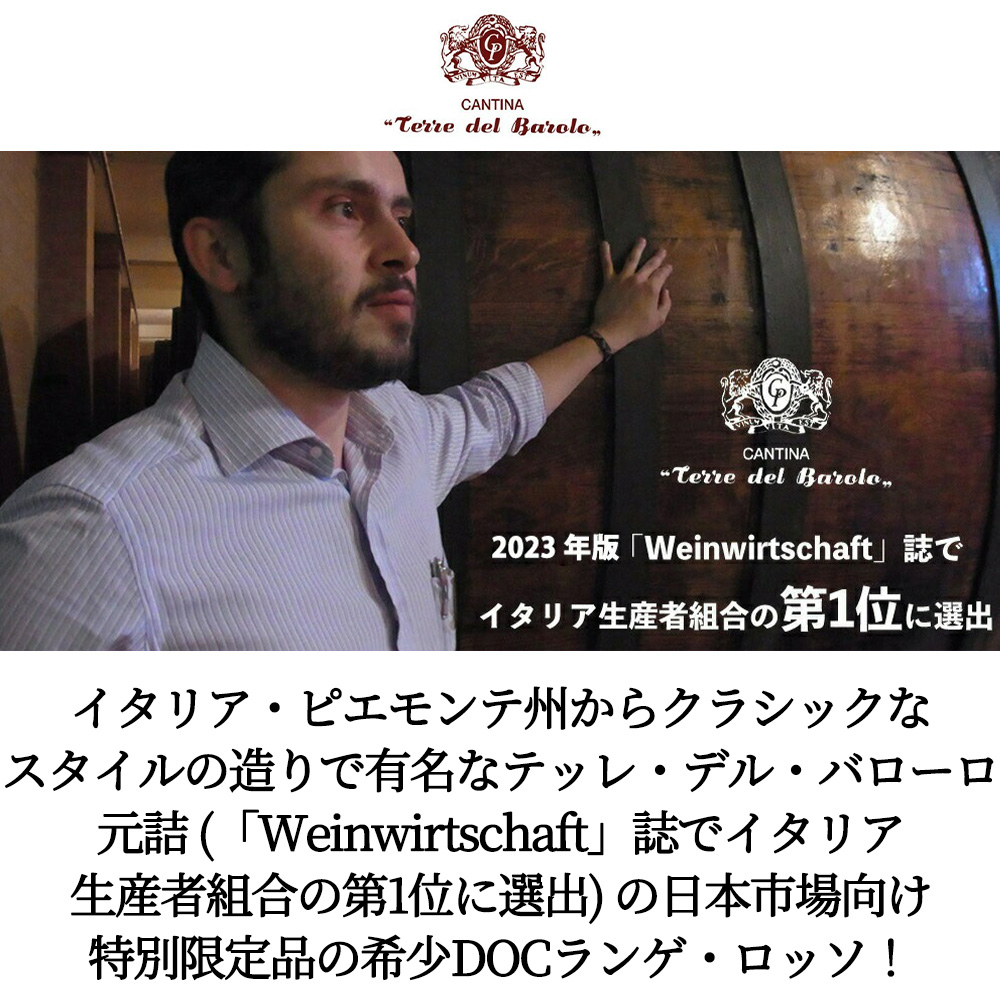 【商品説明】イタリア・ピエモンテ辛口赤ワイン愛好家大注目!バローロの優良生産者が日本市場のために特別に瓶詰めした限定キュヴェ“ランゲ・ロッソ”!2020年版「Weinwirtschaft」誌でイタリア生産者組合の第1位に選出!ガンベロ・ロッソ誌やエスプレッソガイド誌、バートン・アンダーソン「イタリアワイン」でも大注目!イタリアレストラン様をはじめ業務店様にも大人気!バローロ最大級の規模とエノロゴ“ダニエーレ”のセンスを活かしたワイン造り!1958年設立の大人気生産者組合からのクラシックなスタイルの造りで有名なテッレ・デル・バローロ元詰の日本市場向け特別限定品の希少DOCランゲ・ロッソ!主に土壌は粘土石灰質土壌からのドルチェット40%、バルベーラ40%、ネッビオーロ20%を使用!収穫は9月から10月にかけて100%手摘み!収穫した葡萄は除梗、破砕!アルコール発酵はステンレスタンクで28度から30度に温度コントロール!発酵期間は6日から8日間!その間、アロマ、タンニン、豊かな色合いを引き出すため、デレスタージュ (液体を別のタンクに移し、またもとに戻す) を行う!マロラクティック発酵が終わった後、ステンレスタンクでしばらく熟成!しっかりと濃いルビーレッド!小さな赤いベリーやチェリーに加え、甘いスパイスが香る複雑なアロマ!口に含むとシルクのようになめらかなタンニン、そしてミネラルの要素も感じられ、とてもエレガントな口当たり!味わいにも豊かな果実味と甘いスパイスのニュアンスが感じられ、長くしなやかな余韻がある!醸造家ダニエーレ・ポンツォ氏からのコメントは「2019年2月の日本への訪問は私にとって大変素晴らしいものであり、今回の訪日を通して、日本のお客様の嗜好を、私なりに理解することができました。そして、イタリアに戻り、日本の皆様に喜んでいただける新たなワインを造りたいと思い、試行錯誤を重ね、出来上がったのがこのワインです。果実の熟した味わいと複雑さを感じていただけるように造りました。」醸造責任者のダニエーレは来日した際、日本の食文化に触れ、日本のお客様のための特別なワインを造りたいと考えました。2017VTでは、ピノ ネーロとネッビオーロをブレンドしてランゲ ロッソを造りましたが、今回の2018VTはドルチェット、バルベーラ、ネッビオーロをブレンドして造り上げました。バローロを産出できる11の村すべての畑の葡萄を使用。ダニエーレは、「ネッビオーロのスミレとスパイス、バルベーラの果実味とフレッシュさ、ドルチェットの若々しさが表現されています」とコメントしています。ずばりテッレ・デル・バローロ社が日本市場限定で造った熟したニュアンスの強いフルーティーなタイプと一線を画す究極ランゲ・ロッソ!究極辛口赤ワインが限定で少量入荷!ずばりテッレ・デル・バローロ社がバローロの11地区のブドウで造ったハイクリティな究極ランゲ・ロッソDOC!究極辛口赤ワインが限定で少量入荷!