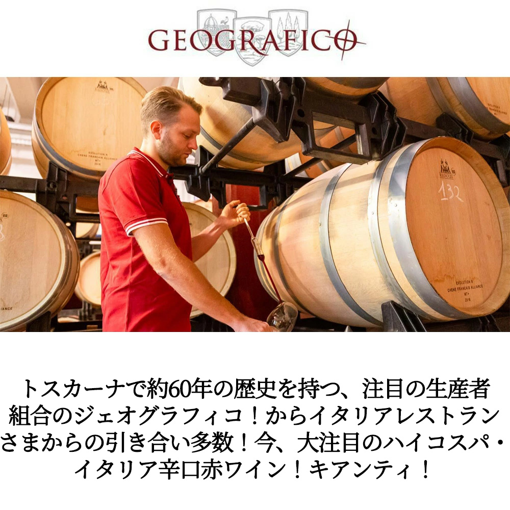 【商品説明】イタリア・トスカーナ・フルボディ辛口赤ワイン愛好家大注目!イタリア・トスカーナ州のサンジョヴェーゼ種(サンジョヴェーゼ90%)フルボディ辛口赤ワイン!イタリアレストランさまからの引き合い多数!今、大注目のハイコスパ・イタリア辛口赤ワイン!キアンティ! 造り手はトスカーナで約60年の歴史を持つ、注目の生産者組合のジェオグラフィコ!(ジェオグラフィコは1961年に17人のワイン農家によってガイオレ・イン・キアンティに設立された歴史ある生産者組合で、現在は60のメンバーを擁しています。2018年に以前より協力関係にあったピッチーニ グループの傘下となり、国内外で活躍する著名なエノロゴ、リッカルド コタレッラをコンサルタントに迎えています。) 土壌は砂と粘土が混ざる砂利質です。畑を注意深く観察し、ベストなタイミングで品質の高い葡萄を収穫します。(サンジョヴェーゼ90%、マルヴァジア・ネーラ5%、カナイオーロ5%)発酵および熟成はステンレスタンクで行います。 赤い果実のフルーティなアロマにスパイスの要素が混ざります。口に含むと生き生きとしたダークチェリーやハーブの要素が感じられます。とても爽やかな余韻が感じられます。フルボディで洗練された味わいを持ちシルキーなタンニンを感じる長い余韻もあります。 リッチでしなやかな口当りが魅力の1本が良心価格で正規品の素晴らしい状態で限定少量入荷!