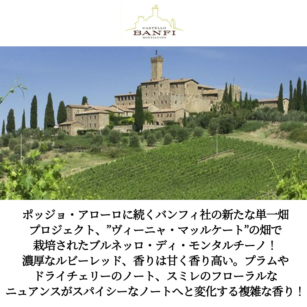 【商品説明】ポッジョ・アローロに続くバンフィ社の新たな単一畑プロジェクト、”ヴィーニャ・マッルケート”の畑で栽培されたブルネッロ・ディ・モンタルチーノです。濃厚なルビーレッド、香りは甘く香り高い。プラムやドライチェリーのノート、スミレのフローラルなニュアンスがスパイシーなノートへと変化する複雑な香り。フルボディで、シルキーなよく溶け込んだタンニンがあり、調和のとれたバランスのよいフィニッシュです。 この2019VTでビベンダ/5グラッポリ獲得! 単一畑“ヴィーニャ・マッルケート”の畑で栽培されたサンジョヴェーゼを100%使用したワインで、ステンレスタンクとフレンチオークを組み合わせたバンフィ社独自の発酵槽を使用。温度管理ができ、かつ木材から酸素供給できる発酵槽で、25-30度で発酵。60-90hLのフレンチオークの大樽で30か月熟成。 濃厚なルビーレッド、香りは力強く豊かで、フレッシュさと持続性を表している。ブラックベリーや熟したチェリーの豊かでフルーティーな香りに、キャロブやイチジクの地中海的要素が合わさった複雑な香り。フィニッシュにはコショウやローリエのスパイシーなノートが感じられる。フルボディでタンニンはシルキーでよく溶け込んでいる。調和の取れたバランスのよい後味は、このワインをユニークで素晴らしく個性的なものにしている。 複雑みがあり、香りが高く、構造のしっかりした料理によく合います。