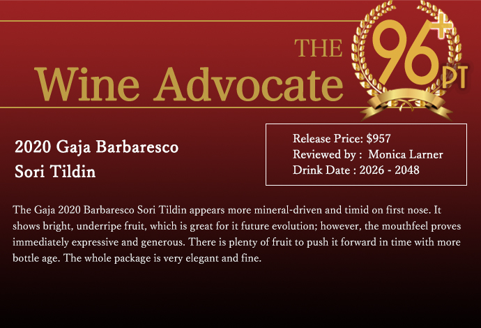【商品名】アンジェロ・ガイア(ガヤ)・バルバレスコ・ソリ・ティルディン[2020]年・蔵出し・アンジェロ・ガヤ元詰・DOCGバルバレスコ・正規代理店輸入品・ワインアドヴォケイト驚異の96+点獲得&ジェームス・サックリング99点&ヴィノス97点&ワインスペクテーター96点・正規品【英名】GAJA Barbaresco Sori Tildin 2020 Angelo GAJA DOCG Barbaresco