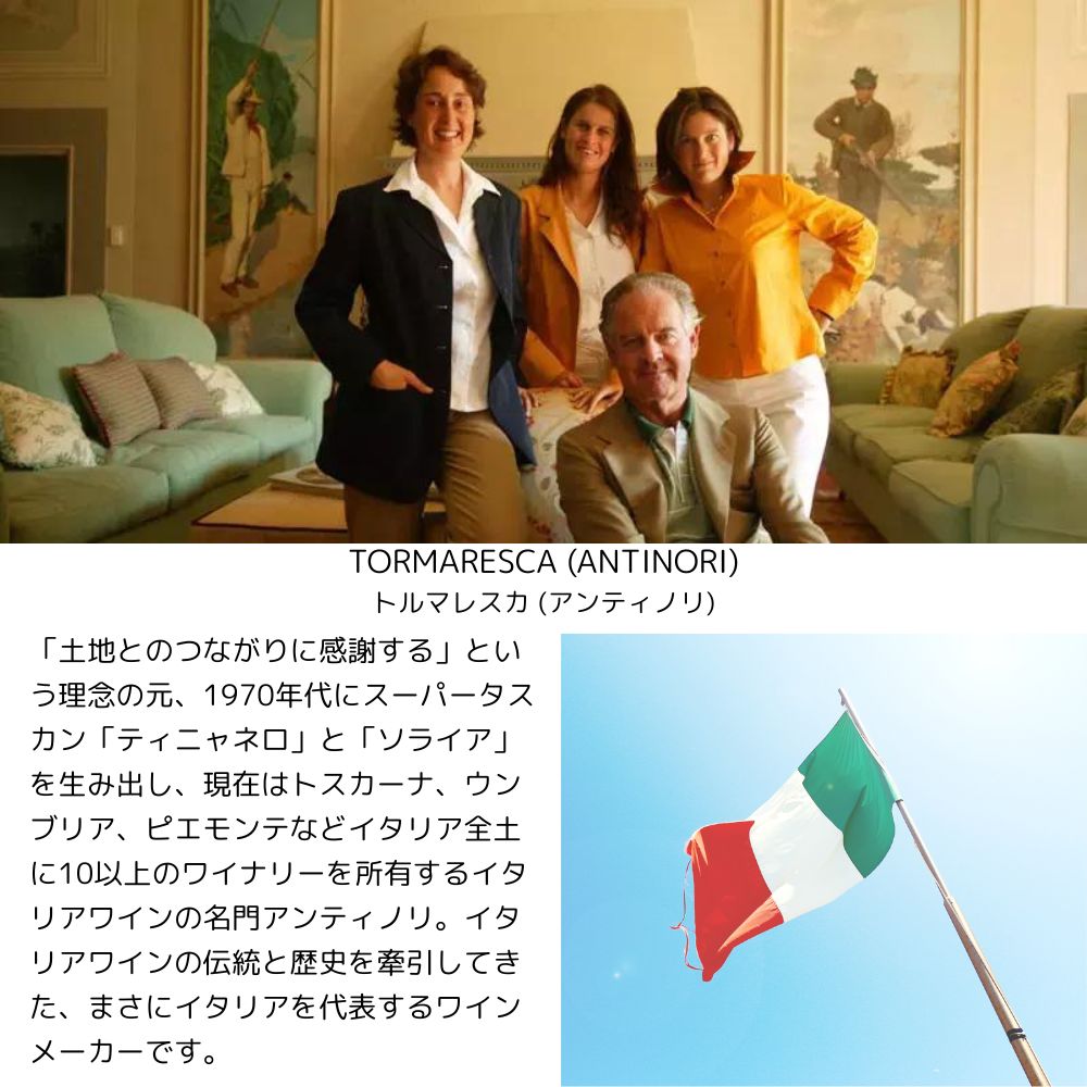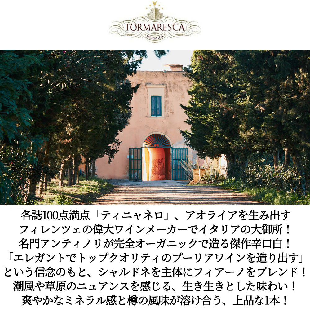 【商品説明】イタリア辛口白ワイン愛好家大注目!アンティノリファン大注目!名門アンティノリが完全オーガニックで造る傑作辛口白ワイン! トルマレスカは名門アンティノリが、イタリア南部のプーリア州で手掛けるワイナリー!アンティノリのワインビジネスは1385年、ジョバンニ=ディ・ピエロ・アンティノリ氏がフィレンツェのワインギルドに加盟したことからスタート!1970年代には、かの有名なスーパータスカンの一つである「ティニャネロ」、「ソライア」を生み出し、その名を世界中に広く知らしめました!そして現代においては、ベストワインメーカーやベストワインプロデューサーなど、数えきれないほどの賞を獲得する26代目当主、ピエロ・アンティノリ侯爵と3人の愛娘が運営!創業当時から変わらぬ家族経営のスタイルを貫いています! そんなアンティノリはトスカーナ州に始まり、北のピエモンテ州から南はシチリア州に渡り、イタリア全土に10以上のワイナリーを所有!イタリア各地において、「その土地のスペシャリスト」とも言うべき、土地の個性をしっかりと表現をした素晴らしいワインを造り出しています!トルマレスカは、そんなアンティノリが1999年からイタリア本島南部のプーリア州で手掛けるワイナリー!質より量というイメージを持たれがちだったプーリアのワインでしたが、アンティノリが長い歴史の中で培った経験と技術を駆使し、このトルマレスカでは土着品種を使ったハイクオリティなワインを生産! このピエトラビアンカは、「エレガントでトップクオリティのプーリア産ワインを造り出す」という信念のもと、シャルドネを主体にフィアーノを少量ブレンドした、潮風や草原のニュアンスを感じる、生き生きとした味わい!DOC.カステル・デル・モンテからの辛口白ワイン!丘陵地ボッカ・ディ・ルーポ (畑の土壌が白い石灰石であることから、 「白い石 (pietra=小石、bianca=白) 」と名付けられています。) の厳選シャルドネ90%にフィアーノ10%をシャルドネの一部約30%のみフレンチオーク樽にて熟成、フィアーノと残りのシャルドネはステンレスタンクにて熟成!翌年1月、一部フレンチオーク樽にて熟成されていたシャルドネはステンレスタンクに移され、残りをブレンドし、さらに熟成! この2023年でワインスペクテーター驚異の90点高評価! 外観は緑がかった輝きのある黄色!グラスからはメロンやオレンジ、ライムなどの果実のアロマが広がります!フローラルなサンザシやスイカズラ、アカシア、ハーブ、ナッツの香りが重なり複雑な印象!口に含むと芳醇な果実味と程よい樽のニュアンスがいっぱいに広がる、果実の旨味が詰まったデリケートですっきりとした味わい!美しい酸味と爽やかなミネラル感を持ち合わせた、バランスに優れた仕上がり!余韻に続く、塩味を感じさせるミネラル感も特徴!肉の西京焼き、天ぷら、サラダ、鶏の水炊き等と相性抜群! 爽やかなミネラル感と樽の風味が溶け合う、上品な1本!名門アンティノリがプーリアで造る傑作オーガニック辛口白ワイン“ピエトラビアンカ”が待望入荷!
