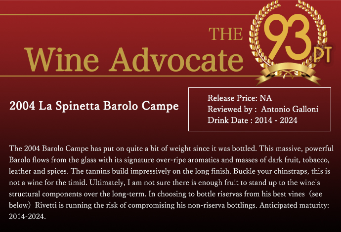 【商品名】バローロ・“カンペ”ラ・スピネッタ[2004]年・希少21年熟成品・蔵出し品・単一畑100%・ラ・スピネッタ社(オーナー・ジョルジョ・リヴェッティ)・DOCGバローロ・正規代理店輸入品・ワインアドヴォケイト誌驚異の93点&ワインスペクテーター誌95点&ガンベロ・ロッソ2ビッキエーリ・ロッシ【英名】Barolo Vigneto Campe La Spinetta 2004 LA SPINETTA DOCG Barolo