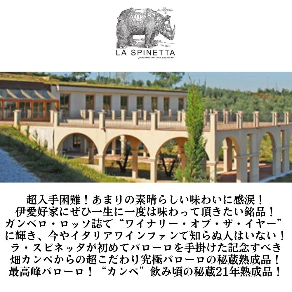【商品説明】イタリア高級辛口フルボディ赤ワイン愛好家注目!高級バローロ愛好家大注目!先日、弊社ワイン会 (2025年3月) にてこの“カンペ”2004年をテイスティングしましたが「ソムリエを含め、熟成したピノ・ノワールと間違えるほど、艶やかで素晴らしい味わいでした。約21年を経てもまだまだ熟成も可能な偉大なワインでした。バローロファンには一生で一度味わって頂きたい銘品です。」! 「イタリアワインの王様」として知られるイタリアワイン最高級“バローロ”!しかもワインアドヴォケイトのヴィンテージチャートにてバローロに驚異の95点を付けるスーパーグレイトヴィンテージ[2004]年もの! 造り手は、ガンベロ・ロッソ誌で“ワイナリー・オブ・ザ・イヤー”に輝き、今やイタリアワインファンで知らぬ人はいない!イタリア屈指のワイナリー!元バローロボーイズのラ・スピネッタ!世界が注目するリヴェッティ氏の造り出したバローロ。2000年のファーストヴィンテージから評価は非常に高く、ラ・スピネッタ社の新たな伝統を生む逸品となりました。熟したベリー、スパイス、カカオ、タバコの香り、芳醇な果実味と上品なタンニン、心地よい酸が印象的なワインが6年目を迎える蔵出し正規品でついに入荷! ラ・スピネッタ社のワインを彩るのは、ドイツ・ルネッサンスの偉大な画家Albrecht (アルブレヒト) 、Durer (デューラー) (1471-1528) のサイですが、バローロのラベルには、百獣の王であるライオンをあしらっています!その威厳ある姿とワインの王カンペ・バローロを重ね合わせています!ラ・スピネッタが初めてバローロを手掛けた記念すべき畑カンペ! グリンツァーネ・カブールにある標高280mの南向きの石灰質土壌の畑で、クリュ・バローロ「ガレッティ」の内部にある恵まれた単一区画畑からの厳選ネッビオーロ100%をフレンチオークの樽でマロラクティック発酵!ミディアムトーストのフランス産オーク樽でマロラクティック発酵 (新樽率30%) &22ヶ月オーク樽熟成!ボトリングの約9ヶ月前にステンレスタンクへ移し、ボトリング後は約11ヶ月瓶内熟成で造られる超こだわり高級バローロ! この2004年でワインアドヴォケイト誌驚異の93点でコメントは「2004年のバローロ・カンペは、瓶詰めされてからかなり重みが増した。このどっしりとした力強いバローロは、その特徴である熟しすぎたアロマと大量のダークフルーツ、タバコ、革、スパイスとともにグラスから溢れ出す。長い余韻にはタンニンが印象的に感じられる。これは臆病者向けのワインではない。結局のところ、長期にわたってこのワインの構造的要素に耐えられるだけの果実味があるかどうかはわからない。」!ワインスペクテーター驚異の95点でコメントは「やや土っぽく、マッシュルームと非常に熟した果実味。ほとんど剪定枝のよう。華やかな果実味へと変化する。フルボディで、スパイシーで肉付きが良く、超熟した果実味。噛み応えのあるタンニン。大きくリッチ。エキゾチック。重厚で、印象的なストラクチャーを持つ。2013年以降がベスト。」!ワインエンスージアスト誌91点でコメント「フレンチオークで2年間熟成させることで、この美しいワインの全体的な品質が形成される。輝きのあるガーネット色で幕を開け、スパイス、アニスの実、ミネラル、黒い果実のアロマへと続く。しっかりとしたタンニンと力強いフィニッシュを持つ、ネッビオーロの貫録ある解釈のワインである。」! 濃いルビー色!アマレーナのアルコール漬けや八角を感じる香り!熟した赤い果実やスパイスの香り!エレガントな味わいで、バルサミコやペパーミント、ベリーを思わせる!凝縮感があり長い余韻には、他の要素とうまく調和するタンニンをしっかりと感じる (バランスのよい樽の味わい、心地よい酸、力強くかつ複雑性に富み、フルーツを感じる余韻は長い。) 濃密な究極フルボディ辛口赤ワインが今や非常に希少な21年熟成の飲み頃ヴィンテージで高評価[2004]年ものが、正規代理店輸入品で蔵出しで限定少量入荷!