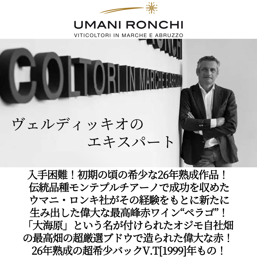 【商品名】ペラゴ・マルケ・ロッソ[1999]年・オジモの自社畑で造られた最高のブドウのみ使用・フレンチオークのバリックで16ヶ月熟成(トロンセ産&アリエ産)・ウマニ・ロンキ社・IGTマルケ・ロッソ・初期の頃の希少な26年熟成作品【英名】Pelago Marche Rosso 1999 Umani Ronchi IGT Marche Rosso