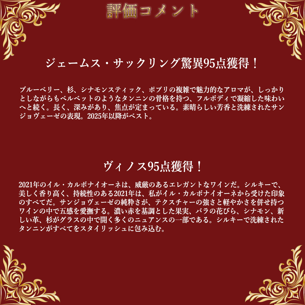イル カルボナイオーネ 2021 ポッジョ スカレッティ元詰 ヴィットリオ フィオーレ ジェームス サックリング驚異95点&ヴィノス95点 IL Carbonaione 2021 Podere Poggio Scalette