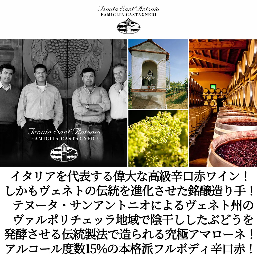 【商品説明】高級イタリア辛口フルボディ赤ワイン愛好家大注目!高級アマローネ愛好家大注目!ヴェネト州が誇る偉大なワイン!「ヴァルポリチェッラに用いるのと同じブドウを陰干ししてつくる、かなり長寿で凝縮されたワイン」と言われる官能的な香りが広がる「ヴァルポリチェッラ」に用いるのと同じ陰干ししてつくる、かなり長熟で凝縮されたワイン」と言われる大人気アマローネ・デッラ・ヴァルポリチェッラ!しかもワインアドヴォケイト誌がアマローネ・デッラ・ヴァルポリチェッラに91点を付けるグッドヴィンテージ! 造り手は、ヴェネトの伝統を進化させたテヌータ・サンアントニオ!1989年設立と比較的新しい生産者ながら、いまやヴェネト州でも名の通ったスターワイナリーへと成長!ヴェネト州の生産者協同組合の設立者であったアントニオ・カスタニェーディ氏を父に持つ4兄弟が力を合わせて運営し、僅か20年ほどでヴェネト州を代表する生産者テヌータ・サンアントニオによる大人気アマローネ・デッラ・ヴァルポリチェッラ! 石灰粘土質、泥質、砂質土壌からの平均樹齢20~25年のコルヴィーナ種70%にロンディネッラ種20%、クロアティーナ5%、オゼレータ5%をステンレス・タンクで25日間主発酵後、オーク樽にてマロ・ラクティック醗酵!フレンチオーク樽の新樽100%で24ヶ月熟成(500L)、ステンレスタンク8ヶ月熟成、瓶熟6ヶ月以上でリリースされる究極フルボディ辛口赤ワイン! この2019年でヴィノス誌驚異の94点でコメントは「2019年のアマローネ・デッラ・ヴァルポリチェッラ・アントニオ・カスタグネディは、ブラックチェリーと砕いたスミレ飴の魅惑的なブレンドにココアをまぶした、ダークで魅力的な味わい。絹のように滑らかで、ほとんどクリーミーでありながらリフトした感触があり、熟した赤い果実と苦味のあるバルサミコ・スパイスが対照をなしている。このワインは若々しい緊張感とともに先細りし、グリップの効いたタンニンのコーティングが残り、残酸によってうまく相殺されている。2019年は素晴らしいバランスがあり、食卓に最適だが熟成も進むだろう。アルコール度数はわずか15%。ゴージャスだ。」と大注目! プラムやカシスジャム、チョコレートや珈琲のアロマ!ふくよかな果実味!つややかで甘味としまりある酸のバランスがとれている!凝縮した印象ながら、上品なワイン! 陰干ししたブドウから造られるヴェネト州を代表する高級辛口赤ワイン“アマローネ”が飲み頃バックヴィンテージ2019年で限定で少量入荷!