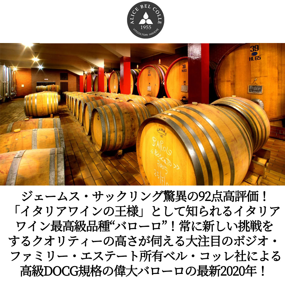 【商品説明】イタリア・ピエモンテ辛口フルボディ赤ワイン愛好家大注目!高級バローロ愛好家大注目!「イタリアワインの王様」として知られるイタリアワイン最高級品種“バローロ”! 造り手は、海外の評論家から注目を集める若き当主ルカ・ボジオ氏!ピエモンテにてルカ・ボジオ氏の両親が1967年から行っていた農業を引き継ぎ設立したボジオ・ファミリー・エステート!伝統を守りつつ、リュット・レゾネ (減農薬農法) や温度管理可能なステンレスタンク発酵槽などの最新の設備を導入するなど、常に新しい挑戦をするクオリティーの高さが伺える大注目のワイナリー!このベル・コッレは、ボジオ・ファミリー・エステートが所有しているワイナリーのひとつ!1970年代にポンテグリョーネ兄弟とジュゼッペ・プリオラ氏の3人によってバローロ地区ヴェルドゥーノ村に設立!ベル・コッレは、バローロの伝統派として知られていましたが、1980年にボジオ・ファミリー・エステートの傘下に入り、リュット・レゾネ (減農薬農法) や醸造設備への投資などの大改革を行い人気も品質も急上昇し、ワイン評論家も大注目! このバローロ・シンポジオ[2020]年でジェームス・サックリング驚異の92点高評価でコメントは「香り高くスパイシーで、熟したチェリー、ラズベリー、ドライハーブ、杉、砕石。ミディアムからフルボディで、しっかりとした、やや噛み応えのあるタンニンがある。テクスチャーがあり、チョーキーで余韻の長いフィニッシュ。2026年から楽しめる。」!ワインエンスージアスト誌でも88点でコメントは「プラムとダークチェリーの豊かなアロマが広がり、スミレのような花の香りがブーケを引き立てる。リッチで口いっぱいに熟した果実味が広がり、チャイ・スパイスとアーシーなフレーバーがワインのバランスを整え、しっかりとした骨格を持ちながらもエレガントなタンニンで締めくくる。」! 厳選したネッビオーロ種100%を3,000-12,000リットルの大樽 (フレンチオークとスロヴェニア産のオーク) で驚異の36ヶ月以上熟成!さらにビン熟成の驚異の長期熟成でリリースされる大人気バローロ!美しく輝くガーネット色!凝縮感のある味わい!芳香性のあるドライフラワーのバラの花やバイオレット、プラムやラズベリーのアロマ!かすかにビターアーモンドやオレンジビターのニュアンス!口に含むと香りがあり滑らかな舌触りを備えたリッチで滑らかなフィニッシュを持つ究極辛口DOCG規格の偉大なバローロ!銘醸造り手ベル・コッレの高級バローロがびっくりプライスでご販売!まさに早いもの勝ちです!お急ぎ下さい!