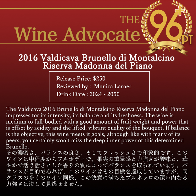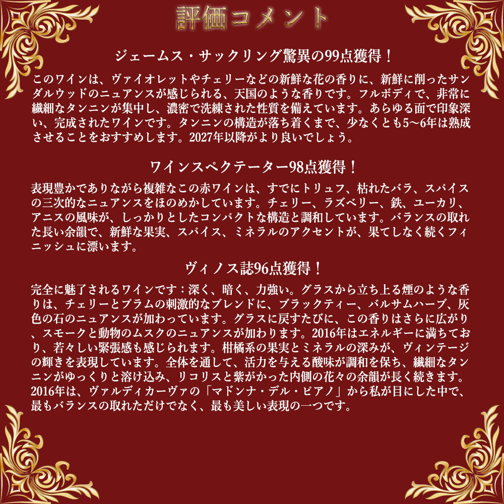 【商品説明】超入手困難!入手困難!イタリア トスカーナ最高級辛口フルボディ赤ワイン愛好家大注目!高級ブルネッロ愛好家垂涎!高級トスカーナ高級赤ワインファン垂涎!ジェームス・サックリング驚異の99点のマドンナ・デル・ピアーノ2016年が遂に超限定入荷!バローロと並ぶ高級イタリア赤ワインの代名詞!ワイン評論家のヒュー・ジョンソン氏に「イタリアで最も名高い赤。アルコール分が強くてコクがあり、強いフレーバーをもち、タンニンが多く、寿命が長い。5年以上寝かせたものをリゼルヴァと呼ぶ。」★★★-★★★★4つ星と絶賛する究極フルボディ辛口赤ワイン! ブルネッロ・ディ・モンタルチーノDOCG!しかも最高峰リゼルヴァもの!しかもワインアドヴォケイト誌でもブルネッロ・ディ・モンタルチーノに98点!ガンベロ・ロッソ誌でも満点5ッ星年!を付けるスーパー・グレイト・ヴィンテージ[2016]年もの!しかも造り手は、100点満点常連“マドンナ・デル・ピアーノ”であまりに有名なヴィーニャ・ディ・ヴァルディカヴァ! ヴィノスのアントニオ・ガローニ氏が「モンタルチーノで最も偉大で、最もドラマチックなワイン」と絶賛!1953年に創業された家族経営のブルネッロ・ディ・モンタルチーノの名門造り手!創業者のブラマンテ・マルティーニ氏は、ブルネッロ・ディ・モンタルチーノが無名であった頃からワインの発展のために寄与し、1966年のDOC認定翌年にできた、ブルネッロ・ディ・モンタルチーノの協会創立時(1967年)のメンバー25人のひとり!また1977年には、ブルネッロの単一畑キュヴェの先駆けとなるフィリッポ・リッピの描く聖母マリアをモチーフにデザインしたラベルで有名な「マドンナ・デル・ピアーノ(=大地の聖母)」をリリース! 当主のヴィンチェンツォ・アブルッツェーゼ氏は、ワインアドヴォケイトにて「1988年以来、次々と優秀なワインを輩出しているモンタルチーノ随一のやり手」と評される凄腕!しかも栽培コンサルタントは元アンティノリの栽培コンサルタントで、ジャコモ・タキス氏とともにスーパートスカーナを造り出したアンドレア・パオレッティ氏!しかも醸造コンサルタントは、古典派ブルネッロの第一人者アッティリオ・パーリ氏!ずばり名門ヴァルディカヴァが誇る最高峰キュヴェで優良年のみ生産される単一畑ブルネッロの先駆けになった究極ブルネッロ・ディ・モンタルチーノ・リゼルヴァ・マドンナ・デル・ピアーノ(「大地の聖母」という意味の単一畑) !土壌はアルベレーゼ、泥灰土!畑に植わるブドウ樹の半分は1978年に、残り半分は1998年に植樹の超厳選サン・ジョヴェーゼ100%を全て手摘みで収穫(グリーンハーヴェストは行わずに自然な方法で収量を制限)!収量は1ha当たり平均30hlに制限され、醗酵にはステンレスタンクとセメントタンクを併用!熟成には最高品質のスラヴォニア産オーク大樽で24~36ヶ月熟成で造られる究極フルボディ辛口赤ワイン! この[2016]年でジェームス・サックリング驚異の99点でコメントは「このワインは、ヴァイオレットやチェリーなどの新鮮な花の香りに、新鮮に削ったサンダルウッドのニュアンスが感じられる、天国のような香りです。フルボディで、非常に繊細なタンニンが集中し、濃密で洗練された性質を備えています。あらゆる面で印象深い、完成されたワインです。タンニンの構造が落ち着くまで、少なくとも5~6年は熟成させることをおすすめします。2027年以降がより良いでしょう。」と激賞! ワインスペクテーター98点でコメントは「表現豊かでありながら複雑なこの赤ワインは、すでにトリュフ、枯れたバラ、スパイスの三次的なニュアンスをほのめかしています。チェリー、ラズベリー、鉄、ユーカリ、アニスの風味が、しっかりとしたコンパクトな構造と調和しています。バランスの取れた長い余韻で、新鮮な果実、スパイス、ミネラルのアクセントが、果てしなく続くフィニッシュに漂います。」! さらにワインアドヴォケイト誌でも驚異の96+点で「その濃密さ、バランスの良さ、そしてフレッシュさで印象的です。このワインは中程度からフルボディで、果実の重量感と力強さが酸味と、華やかで活き活きとした香りの質によってバランスを取られています。バランスが目的であれば、このワインはその目標を達成していますが、同クラスの多くのワイン同様、この決意に満ちたブルネッロの深い内なる力強さは決して見逃せません。」と激賞! ヴィノス誌96点でコメントは「完全に魅了されるワインです:深く、暗く、力強い。グラスから立ち上る煙のような香りは、チェリーとプラムの刺激的なブレンドに、ブラックティー、バルサムハーブ、灰色の石のニュアンスが加わっています。グラスに戻すたびに、この香りはさらに広がり、スモークと動物のムスクのニュアンスが加わります。2016年はエネルギーに満ちており、若々しい緊張感も感じられます。柑橘系の果実とミネラルの深みが、ヴィンテージの輝きを表現しています。全