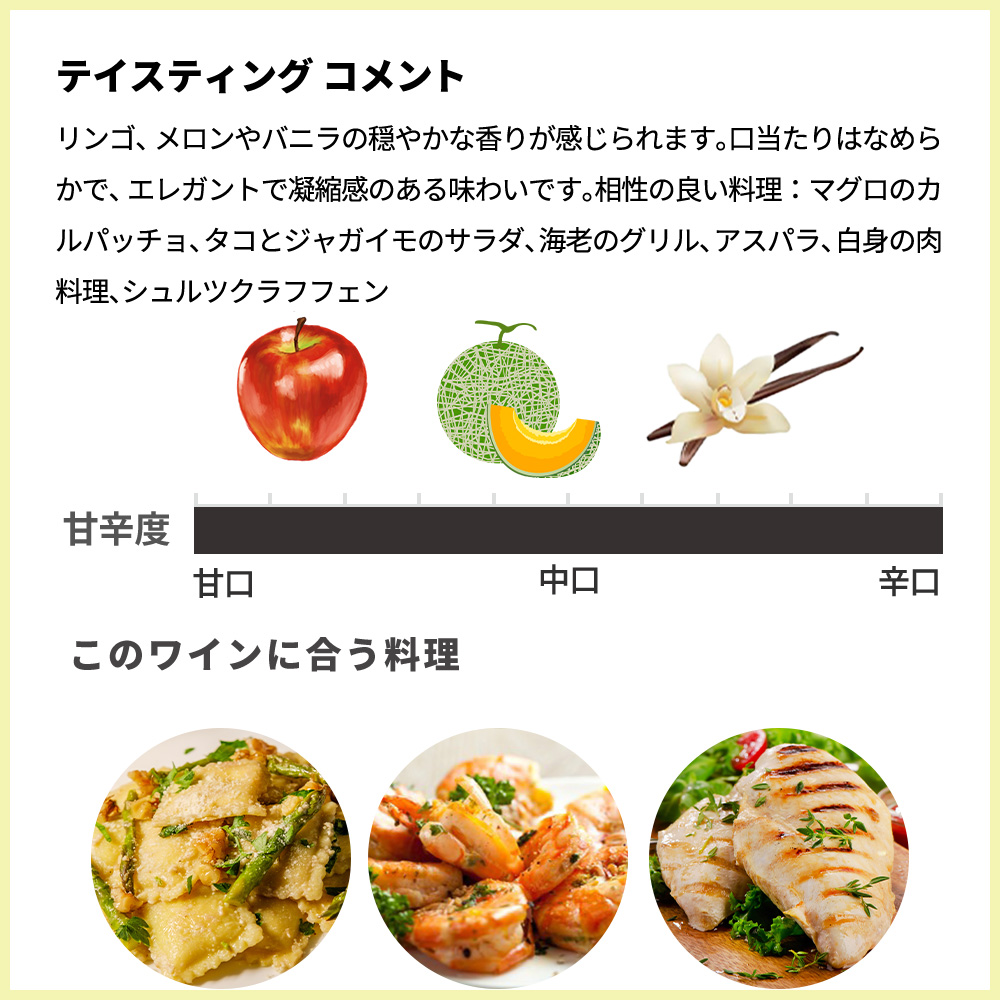 【商品説明】アルト・アディジェ地方の代表的な白ブドウ、ピノ・ビアンコを丁寧に選果。50%はバリックとトノーを、残りはオークの大樽を使用して発酵、約1年間澱と共に熟成させた後ブレンドし、ステンレスタンクで8ヶ月熟成。 かすかにグリーンがかった輝きのある黄金色。リンゴ、メロンやバニラの穏やかな香りが感じられます。口当たりはなめらかで、エレガントで凝縮感のある味わいです。