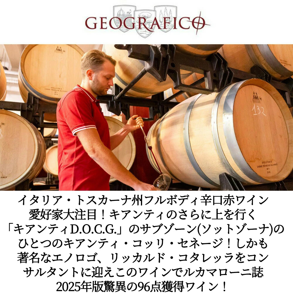 【商品説明】イタリア・トスカーナ州フルボディ辛口赤ワイン愛好家大注目!キアンティ コッリ セネージDOCGは、イタリア・トスカーナ州で造られる赤ワインで、キアンティのさらに上を行く「キアンティD.O.C.G.」のサブゾーン(ソットゾーナ)のひとつです。トスカーナ州のシエナ周辺の丘陵地帯で生産されます。(キアンティD.O.C.G.のソットゾーナ(サブゾーン)のひとつ、コッリ セネージの畑は、キアンティ・クラッシコ・D.O.C.G.の南西、シエナの町を囲む標高約300mの丘陵地帯に位置しており、土壌は砂と粘土を含む砂利質です。)主な葡萄品種はサンジョヴェーゼ(90%前後)で、他にカナイオーロやコロリーナ、メルロやマルヴァジーア ネーラなどがブレンドされます。丘陵地帯の標高(約300m)と砂や粘土を含んだ土壌が形成する、明るくルビー色のワインです。果実味と華やかな香りがあり、ブラックチェリーやスミレ、野生ベリーのアロマが感じられます。エレガントで程よい酸味とタンニン、バランスの良い辛口で、フレッシュかつエレガントな飲み口が特徴です。柔らかくビロードのようなタンニン、しなやかで飲みごたえのある中-フルボディタイプが多いです。合わせる料理としてはトマト系パスタやリゾット、赤身肉や熟成チーズなどが特によく合います。 造り手のGEOGRAFICOは『ジェオグラフィコは1961年に17人のワイン農家によってガイオレ・イン・キアンティに設立された歴史ある生産者組合で、現在は60のメンバーを擁しています。キアンティ・クラッシコ、キアンティ・コッリ・セネージ、ヴェルナッチャ・ディ・サンミジニャーノといったこのエリアの歴史的なアペラシオンを中心にワインを生産しています。現在、ガイオレ・イン・キアンティとサン・ジミニャーノの2ヵ所にセラーを所有しています。2018年からは以前より協力関係にあったピッチーニ・グループの傘下となり、国内外で活躍する著名なエノロゴ、リッカルド・コタレッラをコンサルタントに迎えています。また、トスカーナ出身のエノロゴ、アレッサンドロ・バラベージが醸造チームを率いています。』 また、-醸造家が語る2023VTについて-「ジェオグラフィコにとって、2023VTはこの10 年間で最も良いヴィンテージになりました。実験的に、ヴェルメンティーノとサンジョヴェーゼから、ブラン ド ノワールを造ってみたほどです。収穫量も十分にあります。赤ワイン用の葡萄は、収量は平均より少なくなりましたが、醸し発酵の期間を短くすることで果実味を抽出し過ぎないようにしました。白とロゼ用葡萄は8月末-9月初旬、赤用葡萄は9月初旬から収穫しました」-アレッサンドロ・バラベージ氏 このジェオグラフィコ・ボルゴ・アッラ・テッラ・キアンティ・コッリ・セネージ[2023]年でルカマローニ誌2025年版驚異の96点獲得!サンジョヴェーゼ種90%&カナイオーロ種10%をステンレスタンクとコンクリートタンクで熟成で造られます。キアンティD.O.C.G.よりも厳しい規定があり、高い品質のためにより厳しい選別が行われています。発酵はステンレスタンク、熟成はステンレスタンクとコンクリートタンクで行います。 熟したチェリーやワイルドベリー、アニスの豊かなアロマに加え、微かにスパイスの要素が混ざっています。口に含むとラズベリージャムや地中海のハーブを思わせるフレイバーが広がり、ベルヴェットのようにしなやかなタンニンが心地よく感じられます。 もちろん正規品の素晴らしい状態で限定少量入荷!