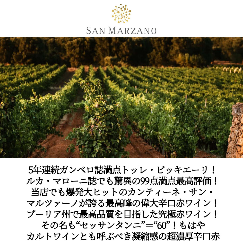 【商品説明】イタリア超フルボディ辛口赤ワイン愛好家大注目!濃厚赤ワイン愛好家必飲!レストランさまや個人愛好家さまから絶大な支持!イタリア・プーリア州の固有品種プリミティーヴォ100%愛好家大注目!深みのある色合いの、こくがあり、なめらかな赤で引き締まった酸と定評のプリミティーヴォ・ディ・マンドゥーリアDOC! なんと!この2019年のセッサンタアンニでガンベロ・ロッソ誌で5年連続で満点3グラス (トッレ・ビッキエーリ) 獲得の快挙!さらにルカ・マローニで驚異の99点の満点評価獲得! 造り手は、イタリアのかかとの部分にあたるサレント半島に位置するワイナリーで、1962年に創業した共同組合!現在は1200以上の栽培農家を抱え、熟練の栽培家らの手によって造られる、太陽、大地の恵みもたっぷりと吸収したプーリアならではの土着品種で、高品質なワイン造りに取り組み、革新的な醸造技術によってブドウとテロワールの魅力を余すところなく表現したワインは、世界中で大人気!当店でも大人気のカンティーネ・サン・マルツァーノの最高級赤ワイン!その名も“セッサンタンニ”=“60”! プーリア州最高品質を目指したワイン!創業当時 (1950年代) から残るアルベレッロ (ブッシュヴァイン) 仕立てで植えられた樹齢60年以上の古木プリミティーヴォから生み出される、超凝縮した貴重なブドウをさらにセレクション、熟成に使用するバリックの産地にもこだわり抜いた、まさにプーリアのいぶし銀的なワイン!樹齢60年以上のプリミティーヴォ種100%をオーク樽12ヶ月 (80%フランス産、20%アメリカ産225L) 、ステンレス・タンク12ヶ月で瓶熟6ヶ月以上 (計30カ月以上の熟成を経て) リリースされるブラックチェリーやプルーンなどのアロマにタバコやスパイスのニュアンスが混ざり合う、複雑で広がりのある香り!バニラやチョコレートやコーヒーのような甘やかな余韻が続く、もはやカルトワインとも呼ぶべき凝縮感の超フルボディ辛口赤ワイン!濃厚赤ワインファン大納得の1本が限定で少量入荷!