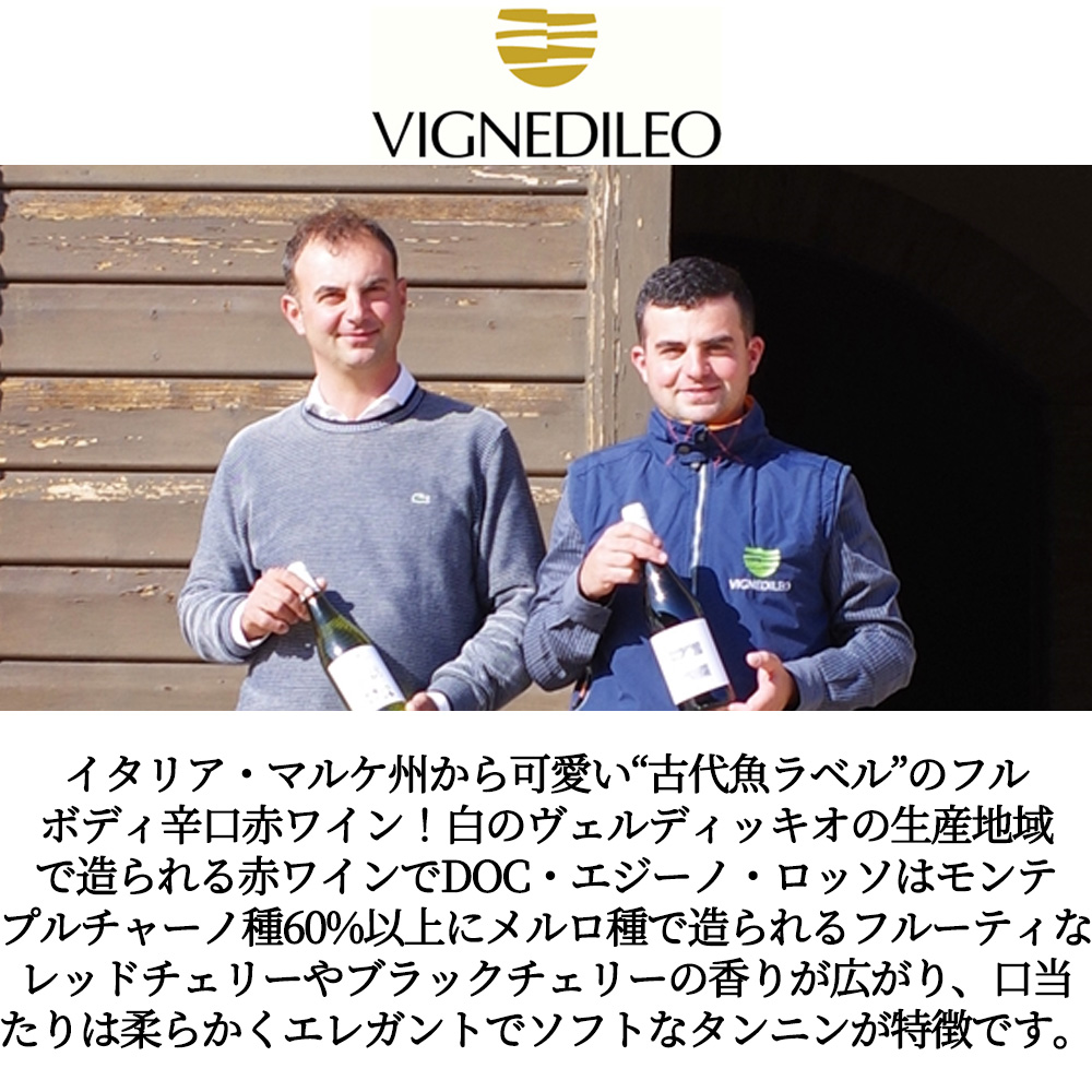 【商品説明】イタリア・マルケ州から可愛い“古代魚ラベル”のフルボディ辛口赤ワイン!白のヴェルディッキオの生産地域で造られる赤ワインでDOC・エジーノ・ロッソはモンテプルチャーノ種60%以上にメルロ種で造られるフルーティなレッドチェリーやブラックチェリーの香りが広がり、口当たりは柔らかくエレガントでソフトなタンニンが特徴です。 “エジーノ”は1995年に承認されたマルケ州の小さなDOCで、マルケ州で2番目に重要な河川であるエジーノ川にちなんで名付けられました。(「エジーノ(Esino)」は、イタリアのマルケ州にある小さなDOC(Denominazione di Origine Controllata、統制原産地呼称)ワインの生産地域の名称です。1995年にこのDOCが承認され、エジーノ川にちなんで命名されています。エジーノDOCはマルケ州内で比較的小さいDOCエリアの一つでこの地域では主に赤ワインが造られており、代表的な品種にはサンジョヴェーゼとモンテプルチアーノが使われています。)赤はサンジョヴェーゼまたはモンテプルチャーノを最低60%使用する必要があります。 造り手のヴィニェディレオは、マルケ州アンコーナ県にあるイエージの町から、15kmほど離れたスタッフォロ村に位置する家族経営の生産者です。(1990年、レオナルド パルパチェッリがアジエンダ・アグリコーラ・トレ・カステッリを設立しました。)ヴィニェディレオの造るワインの品質の高さは、イタリアワイン評価本「ガンベロ ロッソ」でも紹介されています。 (「ワイナリー名にあるレオとはエマヌエレとジャンフィリッポ・パルパチェッリの父レオナルドのことで、彼は夭折したが、地元品種への適切な愛情、厳格に品質を追求して栽培する時の労苦と手作業の重要性、伝統へのこだわりを子供たちに教え込んだ。疲れを知らない2人兄弟は15年にわたりスタッフォロ村のワイン界の規範である。 改築された大きな醸造所では完璧な収穫を行うことができ、出来上がるワインはコスト・パフォーマンスが特に優れている」--「ガンベロ・ロッソ・イタリアワインガイド2016」より抜粋--)(ナイトハーベストにこだわることで実現する、華やかなアロマときれいな果実味!ガンベロ・ロッソも認める、コスト・パフォーマンスに優れたヴェルディッキオで特に有名) 畑の土壌は粘土石灰質、葡萄の仕立てはギヨーです。収穫は気温が低い夜間に行います。品種ごとに別々に醸造します。アルコール発酵は温度管理したステンレスタンクで行います。熟成はコンクリートタンクで6ヶ月行います。レッドチェリーやブラックチェリーを思わせるフルーティなアロマが広がります。口当たりは柔らかく非常にエレガント、ソフトなタンニンが心地よく感じられます。 もちろん正規品の素晴らしい状態で限定少量入荷!(インパクトのある可愛い古代魚のラベルはレストラン様受けしそうです。)