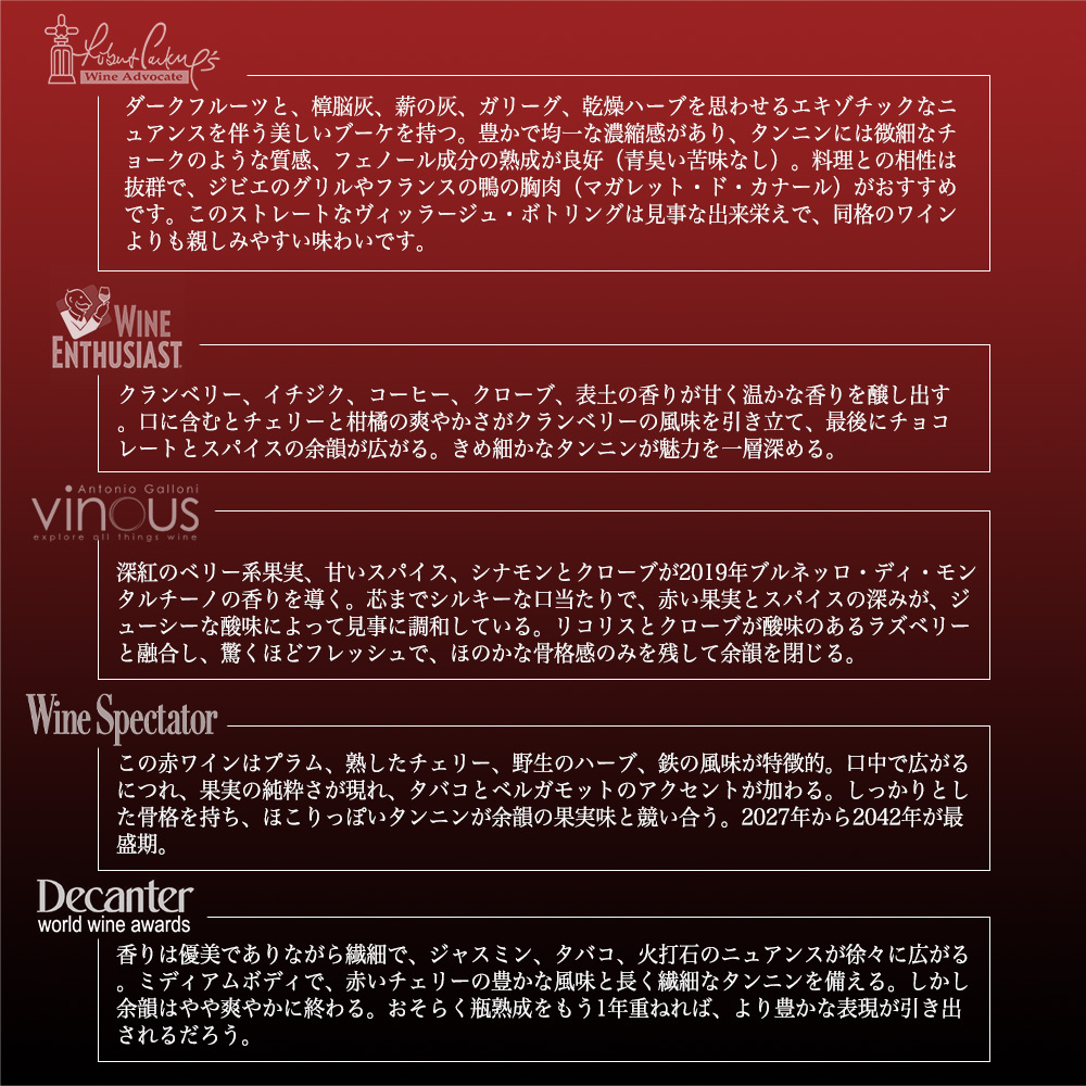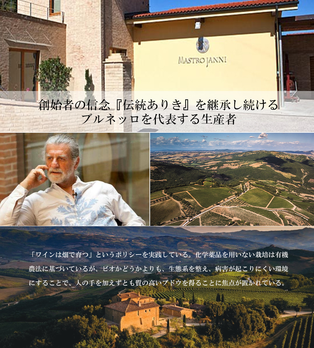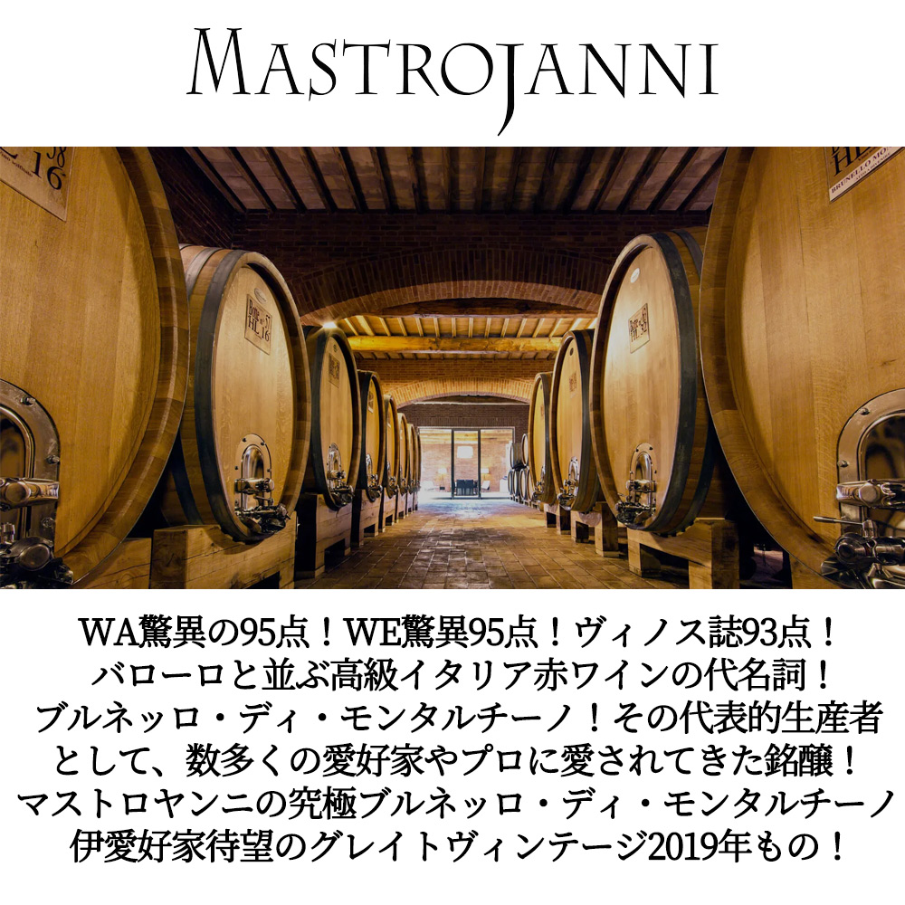 【商品説明】イタリアトスカーナ州フルボディ辛口赤ワイン愛好家大注目! ワイン評論家マット・クレイマーが「飲まずに死ねない」と明言するイタリア最高のワイン、ブルネッロ・ディ・モンタルチーノ! その代表的生産者として、マストロヤンニは数多くの愛好家やプロフェッショナルに愛されてきた。 (「伝統ありき」の信念を守り続けてきたブルネッロを代表する生産者。その味わいは現在でも数多くの愛好家にとって希少な存在として扱われている。) その創業は1975年!このアペラシオンの生産拡大に火をつけたバンフィの設立や、ブルネッロのD.O.C.G.昇格以前のことである! 創始者のマストロヤンニ氏の死後、2008年に醸造所はエスプレッソコーヒーの最大手、グルッポ・イリーの手に渡った!大資本が入ることで全く別のワインになるのでは、と多くの人が危惧したが、イリーが出した買収の条件はむしろ、これまでと同じスタッフ、同じフィロソフィで、マストロヤンニの名の下にワイン造りを続けることだった!特に2人の醸造家アンドレア・マケッティとマウリツィオ・カステッリが醸造所に留まることが必須条件だった!イリーが唯一手を加えたのは、選果台や部分的な木製の発酵槽の導入、セラーの改装など、ハード面のみだった!マストロヤンニの築いてきた伝統とアイデンティティが守られたのは、この買収をグルッポ・イリーに働きかけたフランチェスコ・イリーの功績だ! フランチェスコはマストロヤンニのワインの30年来の愛好家というだけではなく、近隣にポデレ・レ・リピという醸造所を個人的に所有する関係から、ワイン造りをアンドレアとマウリツィオに師事した!彼にとってマストロヤンニは公私ともに最大限の敬意を払うべき存在だった!イリーによる大規模な設備投資のおかげでワインはよりクリーンになり、クオリティは一層向上したが、マストロヤンニの核となる部分は変わらない!大樽での熟成や、設立当時に植樹された古樹から造られる最上クリュヴィーニャ・スキエーナ・ダジノにその伝統が息づく! 2007ヴィンテージで初めてリリースされたヴィーニャ・ロレートは、マストロヤンニ家所有の時代から構想があり、グルッポ・イリーの下で形となった、マストロヤンニの伝統の継承を象徴する新たなクリュ・ブルネッロである! このブルネッロ・ディ・モンタルチーノ[2019]年・マストロヤンニ社でワインアドヴォケイト驚異の95点でコメントは『マストロジャンニ 2019 ブルネッロ・ディ・モンタルチーノは、ダークフルーツと、樟脳灰、薪の灰、ガリーグ、乾燥ハーブを思わせるエキゾチックなニュアンスを伴う美しいブーケを持つ。豊かで均一な濃縮感があり、タンニンには微細なチョークのような質感、フェノール成分の熟成が良好(青臭い苦味なし)。料理との相性は抜群で、ジビエのグリルやフランスの鴨の胸肉(マガレット・ド・カナール)がおすすめです。このストレートなヴィッラージュ・ボトリングは見事な出来栄えで、同格のワインよりも親しみやすい味わいです。』! ワインエンスージアスト誌驚異の95点でコメントは『クランベリー、イチジク、コーヒー、クローブ、表土の香りが甘く温かな香りを醸し出す。口に含むとチェリーと柑橘の爽やかさがクランベリーの風味を引き立て、最後にチョコレートとスパイスの余韻が広がる。きめ細かなタンニンが魅力を一層深める。』! ヴィノス誌93点でコメントは『深紅のベリー系果実、甘いスパイス、シナモンとクローブが2019年ブルネッロ・ディ・モンタルチーノの香りを導く。芯までシルキーな口当たりで、赤い果実とスパイスの深みが、ジューシーな酸味によって見事に調和している。リコリスとクローブが酸味のあるラズベリーと融合し、2019年ヴィンテージは驚くほどフレッシュで、ほのかな骨格感のみを残して余韻を閉じる。』! ワインスペクテーター93点でコメントは『この赤ワインはプラム、熟したチェリー、野生のハーブ、鉄の風味が特徴的。口中で広がるにつれ、果実の純粋さが現れ、タバコとベルガモットのアクセントが加わる。しっかりとした骨格を持ち、ほこりっぽいタンニンが余韻の果実味と競い合う。2027年から2042年が最盛期。』! デカンタ誌91点でコメントは『香りは優美でありながら繊細で、ジャスミン、タバコ、火打石のニュアンスが徐々に広がる。ミディアムボディで、赤いチェリーの豊かな風味と長く繊細なタンニンを備える。しかし余韻はやや爽やかに終わる。おそらく瓶熟成をもう1年重ねれば、より豊かな表現が引き出されるだろう。』と大注目! 海抜190-400mに広がる日照豊かな南西-西向き斜面の畑から、ブルネッロ用に区画を厳選。粒の小さな熟した果実のジューシーなアロマに、スモークやスパイスのニュアンスが深みを添える。細かなタンニンに包まれた艶のある果実。エキスに満ちた端正かつ享楽的な味わいには、この作品に続くクリュ・ブルネッロへの期待がかきたてられる。しかもグ
