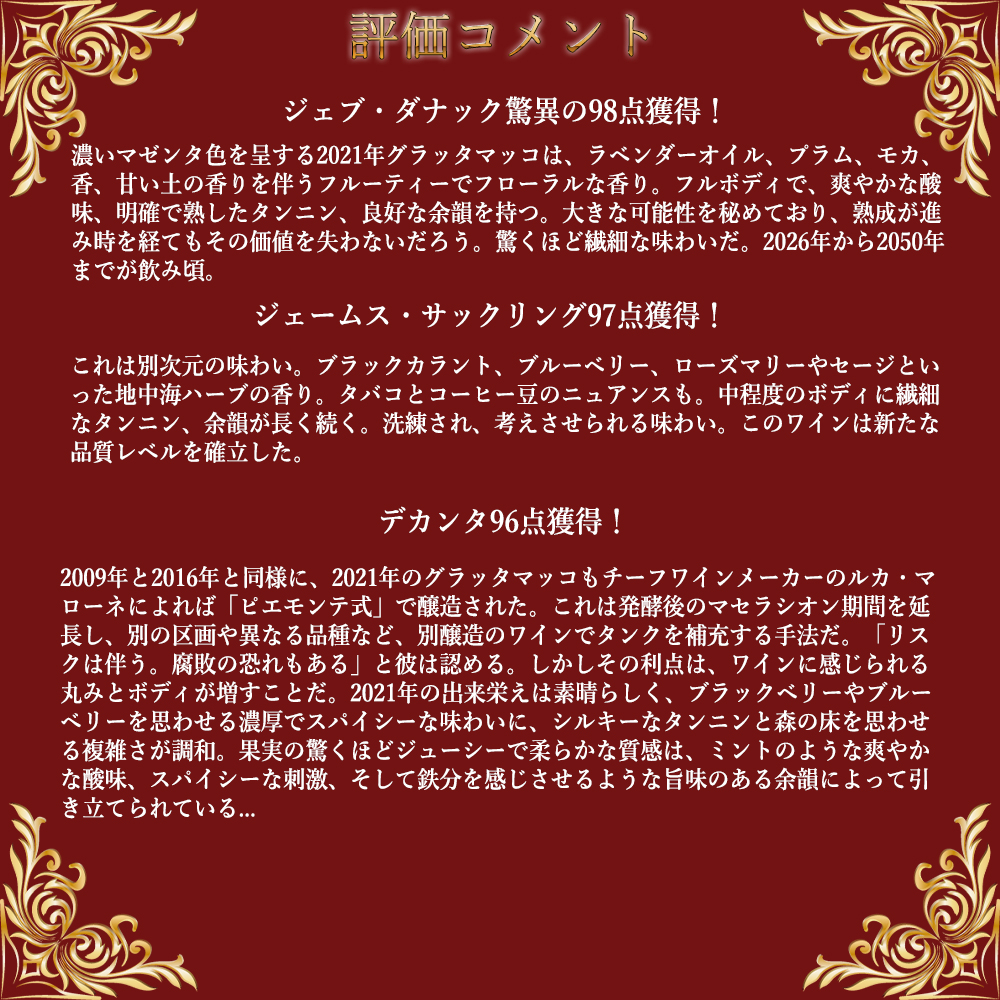 【商品名】グラッタマッコ・ロッソ[2021]年・蔵出し品・手摘み100%・オークのバリック樽熟成&瓶熟12ヶ月・DOCボルゲリ・ロッソ・スペリオーレ・ポデーレ・グラタマッコ・ジェブ・ダナック驚異の98点&ジェームス・サックリング97点&デカンタ96点&ワインアドヴォケイト96点