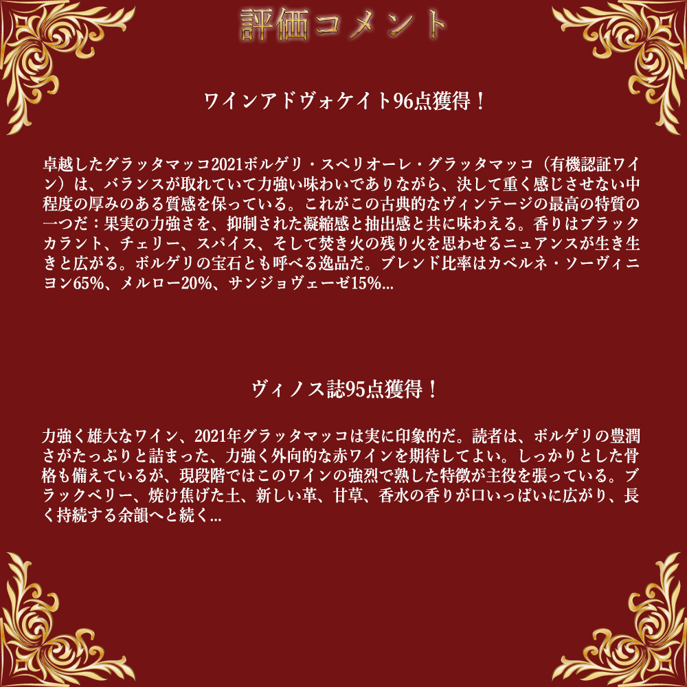 【商品説明】イタリアフルボディ辛口赤ワイン愛好家大注目!スーパータスカン愛好家大注目!あのサッシカイア、オルネライアと並ぶ3大ボルゲリのひとつ (サッシカイアに続いて2番目にボルゲリでスーパートスカンを造りはじめた歴史を誇る3大ボルゲリで有名) !1977年にカヴァラーリ家が創立!サンジョヴェーゼ栽培が難しいボルゲリ地区でも「グラッタマッコ」は丘の上、海に面したカスタニェート・カルドゥッチとボルゲリの間で、海抜100mに畑があり、高品質なサン・ジョヴェーゼを栽培!ボルゲリワインながらサン・ジョヴェーゼをブレンドし、一般的に濃密な味わいのスーパートスカンとは一線を画したエレガントで芯が強くしなやかな味わいのクラシカルな旨みに満ちたスタイルで大人気!ピエール・マリーオ&パオラ・メレッティによる大人気“グラッタマッコ”(ICEA認証を受けているオーガニックワインのワイナリー)! この2021年でジェブ・ダナック驚異の98点でコメントは「濃いマゼンタ色を呈する2021年グラッタマッコは、ラベンダーオイル、プラム、モカ、香、甘い土の香りを伴うフルーティーでフローラルな香り。フルボディで、爽やかな酸味、明確で熟したタンニン、良好な余韻を持つ。大きな可能性を秘めており、熟成が進み時を経てもその価値を失わないだろう。驚くほど繊細な味わいだ。2026年から2050年までが飲み頃。」! ジェームス・サックリング97点でコメントは「これは別次元の味わい。ブラックカラント、ブルーベリー、ローズマリーやセージといった地中海ハーブの香り。タバコとコーヒー豆のニュアンスも。中程度のボディに繊細なタンニン、余韻が長く続く。洗練され、考えさせられる味わい。このワインは新たな品質レベルを確立した。」! デカンタ96点でコメントは「2009年と2016年と同様に、2021年のグラッタマッコもチーフワインメーカーのルカ・マローネによれば「ピエモンテ式」で醸造された。これは発酵後のマセラシオン期間を延長し、別の区画や異なる品種など、別醸造のワインでタンクを補充する手法だ。「リスクは伴う。腐敗の恐れもある」と彼は認める。しかしその利点は、ワインに感じられる丸みとボディが増すことだ。2021年の出来栄えは素晴らしく、ブラックベリーやブルーベリーを思わせる濃厚でスパイシーな味わいに、シルキーなタンニンと森の床を思わせる複雑さが調和。果実の驚くほどジューシーで柔らかな質感は、ミントのような爽やかな酸味、スパイシーな刺激、そして鉄分を感じさせるような旨味のある余韻によって引き立てられている...」! ワインアドヴォケイト96点でコメントは「卓越したグラッタマッコ2021ボルゲリ・スペリオーレ・グラッタマッコ(有機認証ワイン)は、バランスが取れていて力強い味わいでありながら、決して重く感じさせない中程度の厚みのある質感を保っている。これがこの古典的なヴィンテージの最高の特質の一つだ:果実の力強さを、抑制された凝縮感と抽出感と共に味わえる。香りはブラックカラント、チェリー、スパイス、そして焚き火の残り火を思わせるニュアンスが生き生きと広がる。ボルゲリの宝石とも呼べる逸品だ。ブレンド比率はカベルネ・ソーヴィニヨン65%、メルロー20%、サンジョヴェーゼ15%...」! ヴィノス誌95点でコメントは「力強く雄大なワイン、2021年グラッタマッコは実に印象的だ。読者は、ボルゲリの豊潤さがたっぷりと詰まった、力強く外向的な赤ワインを期待してよい。しっかりとした骨格も備えているが、現段階ではこのワインの強烈で熟した特徴が主役を張っている。ブラックベリー、焼け焦げた土、新しい革、甘草、香水の香りが口いっぱいに広がり、長く持続する余韻へと続く...」と絶賛!(なんとグラッタマッコの天才エノロゴ ルカ・マッローネ氏はガンベロ・ロッソ誌2017年度では最高賞を、このグラッタマッコ、モンテクッコ・ロッソ・リゼルヴァ、ポッジョ・ディ・ソットブルネッロ・ディ・モンタルチーノの3ワイン同時に最高賞3グラスを獲得!)ビベンダ誌満点5つ房獲得! カベルネ・ソーヴィニヨン65%、メルロ20%、サンジョヴェーゼ15%をティネッロで自然発酵、やさしくパンチングダウンを繰り返しながら長期間マセラシオン、その後、オークのバリックで18ヶ月熟成!瓶熟12ヶ月以上でリリース!されるこのワインは、スミレやチェリー、ブラックベリーに甘いスパイスのアロマ! フルボディでエレガントでフレッシュな果実味とかすかにココナッツのニュアンスを感じさせる繊細なトースト!そしてしっかりとしたタンニンの究極フルボディ赤ワイン!銘醸3大ボルゲリ“グラッタマッコ”が高評価続出[2021]年で正規代理店輸入品で限定で少量入荷!