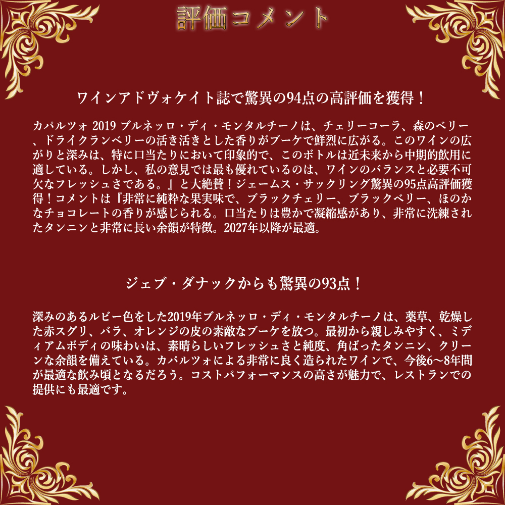 【商品説明】イタリア辛口フルボディ赤ワイン愛好家大注目!バローロと並びイタリアで最も名高い赤ワインであり、アルコール分が強くてコクがあり、強いフレーバーをもち、タンニンが多く、寿命が長く、4年以上の熟成の義務がある高級ワイン!ずばりブルネッロ・ディ・モンタルチーノ!しかもワインアドヴォケイト誌がブルネッロに驚異の95点を付けるグレイトヴィンテージ[2019]年もの! 造り手はブルネッロ・ディ・モンタルチーノの生産エリアに本拠地がある数少ない歴史あるワイナリーのひとつでありながら、現代派のブルネッロとして定評!バートン・アンダースンの「イタリアワイン」でも大注目!ガンベロ・ロッソ誌、ヴェロネッリ誌、マット・クレイマー氏「Making Sense of Italian Wine」でも大注目! ロバート・パーカー★★★★4つ星生産者であり、この大人気のグレイト![2019]年ものでワインアドヴォケイト誌で驚異の94点の高評価を獲得!絶賛コメントは『カパルツォ 2019 ブルネッロ・ディ・モンタルチーノは、チェリーコーラ、森のベリー、ドライクランベリーの活き活きとした香りがブーケで鮮烈に広がる。このワインの広がりと深みは、特に口当たりにおいて印象的で、このボトルは近未来から中期的飲用に適している。しかし、私の意見では最も優れているのは、ワインのバランスと必要不可欠なフレッシュさである。』と大絶賛!ジェームス・サックリング驚異の95点高評価獲得!コメントは『非常に純粋な果実味で、ブラックチェリー、ブラックベリー、ほのかなチョコレートの香りが感じられる。口当たりは豊かで凝縮感があり、非常に洗練されたタンニンと非常に長い余韻が特徴。2027年以降が最適。』と大注目! ジェブ・ダナックからも驚異の93点獲得で『深みのあるルビー色をした2019年ブルネッロ・ディ・モンタルチーノは、薬草、乾燥した赤スグリ、バラ、オレンジの皮の素敵なブーケを放つ。最初から親しみやすく、ミディアムボディの味わいは、素晴らしいフレッシュさと純度、角ばったタンニン、クリーンな余韻を備えている。カパルツォによる非常に良く造られたワインで、今後6~8年間が最適な飲み頃となるだろう。コストパフォーマンスの高さが魅力で、レストランでの提供にも最適です。』と絶賛! 各ワインプレス軒並み高評価の造り手による、カパルツォ、ラ・カドゥータ、カッセーロ、サンピエトロ・カッセーレの南-南東の日当たりの良い畑からのブルネッロを手摘み100%!伝統的な50-80hlのオーク樽で36ヶ月熟成!さらに瓶内で4ヶ月以上の熟成! (発酵の最初の2日間、種に特別な注意が払われ、十分に熟していない場合は取り除かれる。一次発酵は28-30度に管理された温度で7日間行われ、その後デレスタージュとポンプ・オーバーが行われる。果皮の質が素晴らしいので、ワインはさらに10-15日間果皮と接触させる。ワインは伝統的な80ヘクトリットルのスラヴォニアン・オークと50ヘクトリットルのフレンチ・オークで3年間熟成され、その後最低4ヶ月の瓶内熟成を経てリリースされる。) を経てリリースされる究極ブルネッロ・ディ・モンタルチーノ! 「世界で引っ張りだこのワインだ」!とワイナリーも自ら胸を張る渾身作品!数年ですばらしい状態になり、その後20年以上もの長い年月の間ピークを保つといわれる、究極ブルネッロ・ディ・モンタルチーノの飲み頃大人気グレイトヴィンテージ[2019]年が限定で少量入荷!
