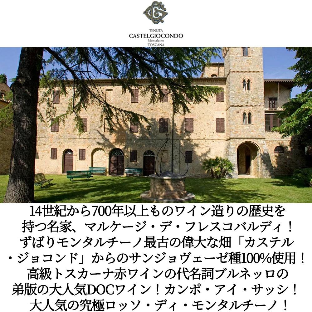 【商品名】フレスコバルディ・カンポ・アイ・サッシ・カステル・ジョコンド・ロッソ・ディ・モンタルチーノ[2024]年・蔵出し品・テヌータ・カステルジョコンド・エステート・フレスコバルディ社・(マルケージ・デ・フレスコバルディ社)元詰・DOCロッソ・ディ・モンタルチーノ【英名】Frescobaldi Campo Ai Sassi Castelgiocondo Rosso di Montalcino 2024 Frescobaldi DOC Rosso di Montalcino