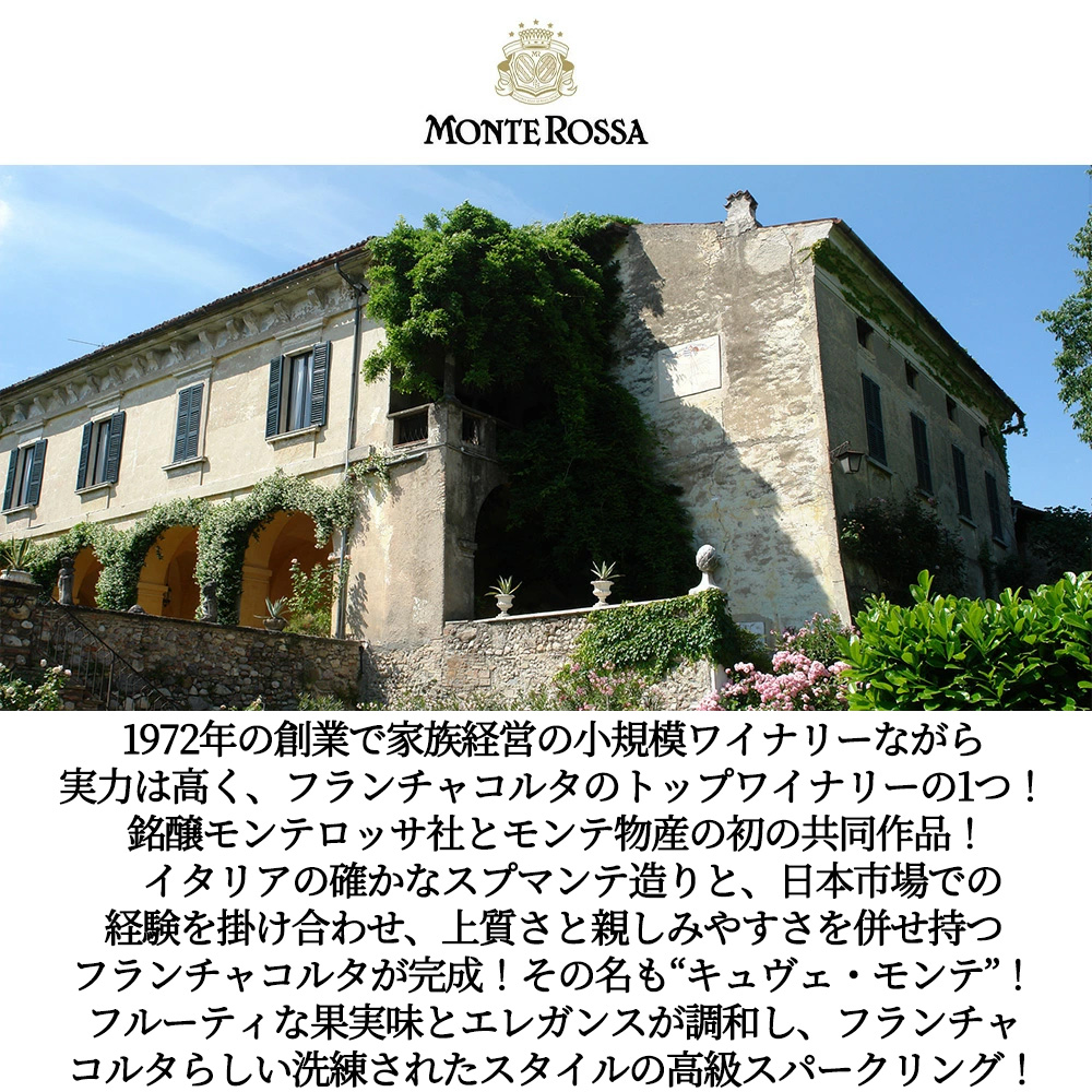 【商品名】フランチャコルタ・モンテ・ロッサ・ブリュット・キュヴェ・モンテ・(モンテ・ロッサ社)・DOCGフランチャコルタ・ブリュット・瓶内二次発酵(シャンパン方式)・最低20ヶ月熟成・醸造責任者・チェザーレ・フェッラーリ・750ml・白・辛口・スパークリングワイン【英名】Monte Rossa Franciacorta Brut Cuvee Monte DOCG Franciacorta Brut