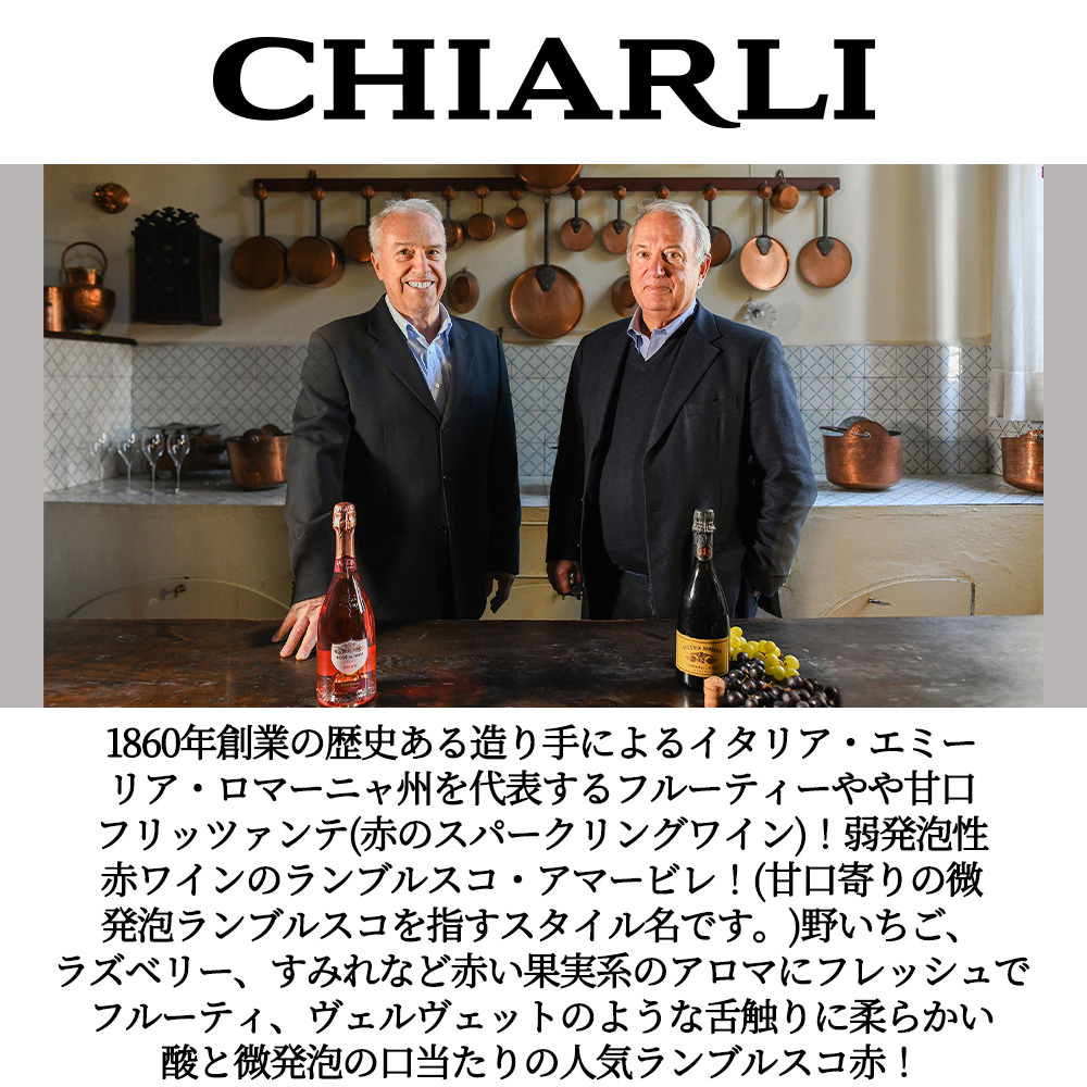 【商品説明】イタリア弱発泡性やや甘口赤ワイン!エミーリア・ロマーニャ州を代表するフルーティーやや甘口フリッツァンテ(赤のスパークリングワイン)!赤のランブルスコ・アマービレ・ファン大注目!(ランブルスコ・アマービレは、イタリア・エミリア=ロマーニャを中心に造られる、甘口寄りの微発泡ランブルスコを指すスタイル名です。) キュヴェ名の「Il Mio」はイタリア語で「私の」という意味です。この表現は、親しい相手や大切な人に対して使われ、感情や関係性を示す際に用いられます。この場合「私のランブルスコ」の意味。 野いちご、ラズベリー、すみれなど赤い果実系のアロマにフレッシュでフルーティ、野いちごとすみれ、甘口微発泡でヴェルヴェットのような舌触りに柔らかい酸と微発泡の口当たりの人気ランブルスコ赤! 造り手のキアリ社は1860年創業の、イタリアのエミリア地方で最も古く歴史あるランブルスコの生産者。モデナでレストランを営むクレー・キアリ家が自分たちの店で常連客に出すためにランブルスコを造ったのが始まりです。(それから150年が経ち、品質の向上に努めた結果、ランブルスコのトップブランドとして30ヶ国以上の人々に愛されるワインメーカーとなりました。キアルリはランブルスコの造り手として最も古い1860年の創業。1900年のパリ万博で「Mention Honorable(審査員特別賞)」を受賞してその名を知らしめ、戦後はエミリア地方で初めてシャルマ方式を導入して最新技術を用いながら、「品質に妥協をすることなく、土地を表現するワインを造らなければならない」という、創業者の理念を忠実に守り続け、発展を続けています!) 最高峰ランブルスコの決定版! 160年以上の歴史を誇る老舗生産者 キアルリ ランブルスコの奥深さが楽しめる ランブルスコマエストリ種、マラーニ種他をブレンド。シャルマ方式によって醸造されています。 イチゴやブルーベリーの味わい。ルビーレッドの色合いで、心地よく魅力的なロゼの泡があります。快適で若々しい酸味があり、味わいはクリーンで滑らか、心地よい甘くフルーティな香りがします。 生ハム(特にパルマ産プロシュット)やサラミなど塩気・脂のあるシャルキュトリと好相性です。軽めの前菜、トマトソースのパスタ、焼き鳥や豚肉料理、すき焼きなど、甘味と酸がソースやタレに寄り添う料理にも向くという提案があります。フルーツ系デザートやブルーチーズ(ゴルゴンゾーラ)と合わせるスタイルも紹介されています。