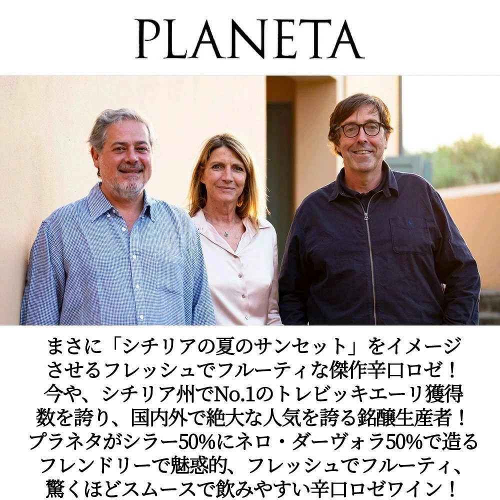 【商品説明】高級イタリア辛口ロゼワイン愛好家大注目!レストランさまにも大人気アイテム! まさに「シチリアの夏のサンセット」をイメージさせるフレッシュでフルーティな傑作辛口ロゼワイン! プラネタのフレッシュでフルーティなロゼは、一言で言い表すならまさに「シチリアの夏」!色はまるでシチリアの夏のサンセット、フレンドリーで魅惑的なイチゴのアロマで驚くほどスムースで飲みやすいワイン! 今や、シチリア州でNo.1のトレビッキエーリ獲得数を誇り、国内外で絶大な人気を誇るワイナリー「プラネタ」!プラネタ家とシチリアの歴史は15世紀まで遡るという非常に歴史ある生産者!15世紀にスペインより、シチリア西部のメソフィに移住してきた男爵家!5世紀もの間、17世代にわたり、プラネタ家は、シチリアの複雑な土地での農業進化に関わり、柔軟に革新的に取り組んできた名門!現オーナー世代の祖父にあたるヴィト プラネタ氏は、小さな家族経営のワイナリーを大規模な協同組合のワイナリーへと変え、現オーナー世代の父にあたるディエゴ プラネタ氏の経営の下で世界でも有数の協同組合に成長させ貢献!「シチリアでも高品質なワインを造ることが出来る」とさらなる確信をしていたが、大規模な協同組合のワイナリーで共有し実現することはこれ以上、不可能だと思い、自分の家族「プラネタ家」として高品質なワインを造ることを決断!そして、プラネタ家が500年間農業を営んできた古い要塞に囲まれたウルモの土地で、今までの経験とアイデアの全てを結集させ、高い志のもと、ディエゴの娘フランチェスカ氏、従兄弟のアレッシオ氏とサンティ氏で新しく会社を設立するプロジェクトをスタート!1985年、最初のブドウ園をウルモに設け、“新生プラネタ”が誕生!今では5つの土地 (メンフィ~エトナまで) に、6つのブティックワイナリーを所有する「ガンベロ ロッソ」でのトレビッキエーリ獲得数がシチリア州No.1となり名実共にシチリアを代表する造り手となったプラネタ家が誇る愛好家に大人気の辛口ロゼワイン! このプラネタ・ロゼは、シラー50%にネロ ダーヴォラ50%!ブドウは除茎されて1~2時間のマセレーションをしながら優しくプレスされます!果汁は一晩冷所に保管された後、厳選された酵母が加えられます!発酵はステンレススチールタンクで行われます!“シチリアの夕日”と表現される淡くオレンジがかったピンク色!ハイビスカスやローズヒップのフローラルなトーン、ザクロ、野イチゴ、ブラックベリー、熟したメロンなどの果実を想わせるチャーミングな香りと優しい口当たり!フレッシュでフルーティな飲み心地の良い辛口のロゼ!フレンドリーで魅惑的、驚くほどスムースで飲みやすい辛口ロゼワインが限定で少量入荷!食前酒として、生の魚介類、タパス、揚げ物、生ハム サラミ類、フルーツ、和食とも相性抜群です!