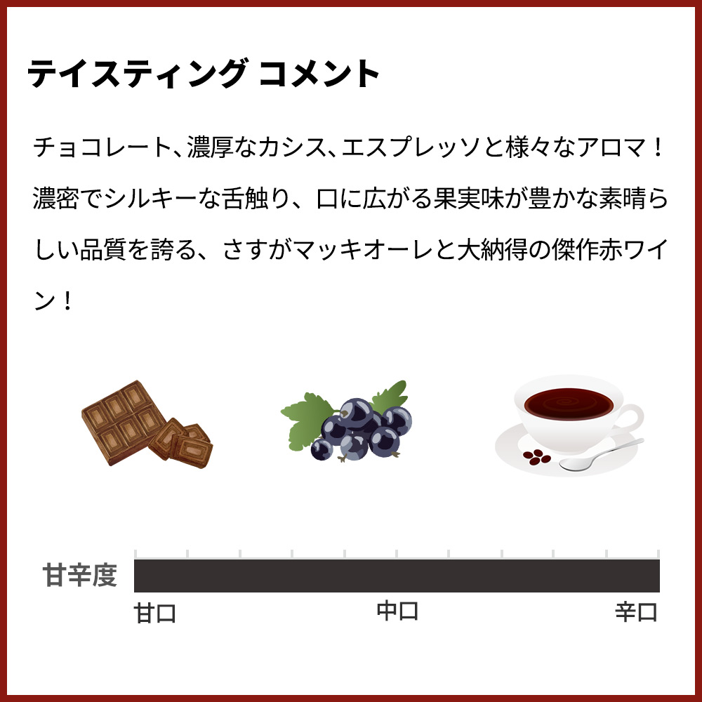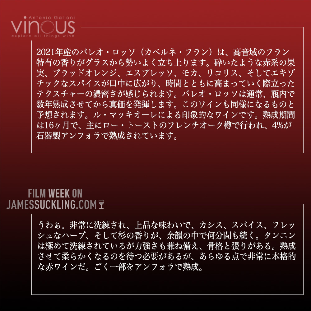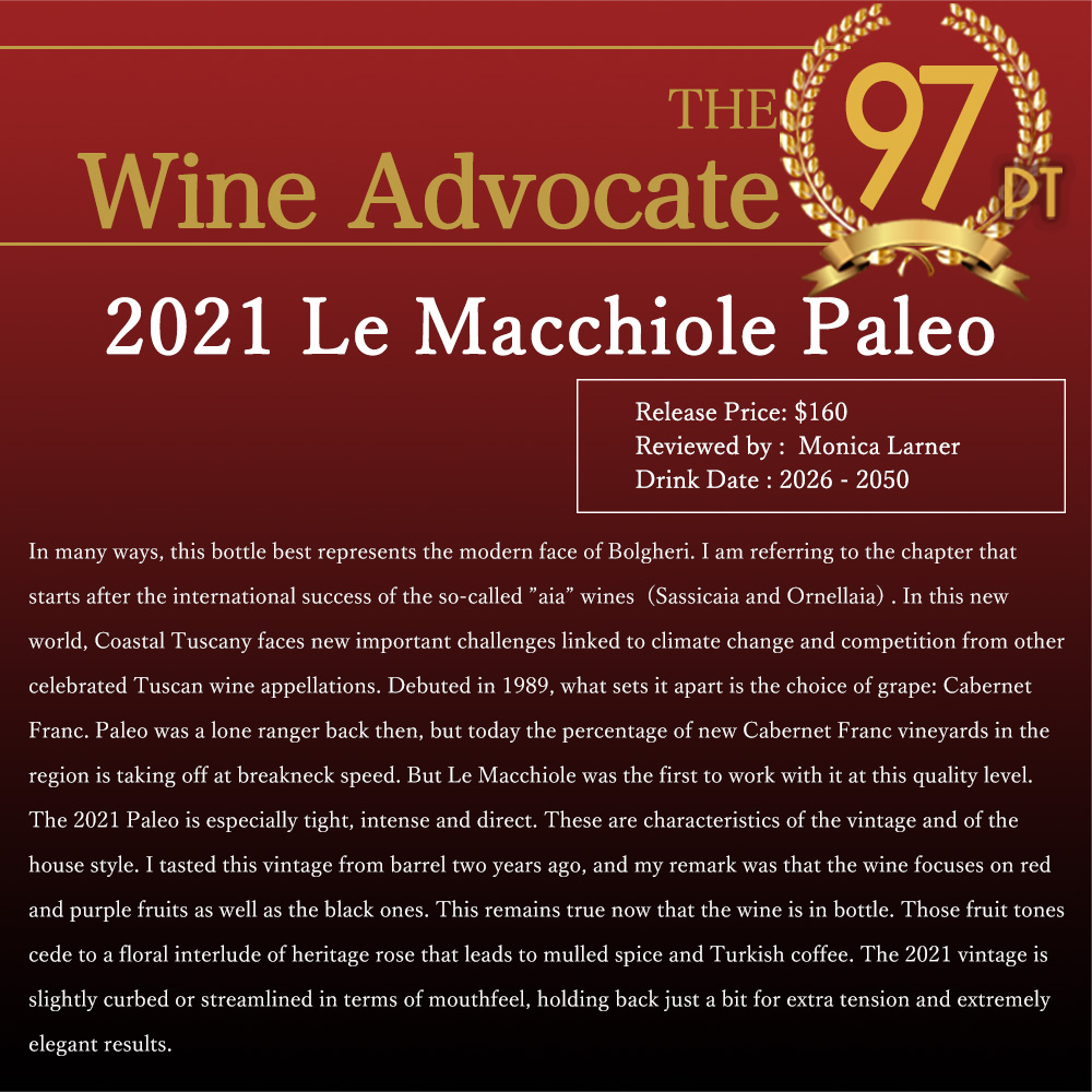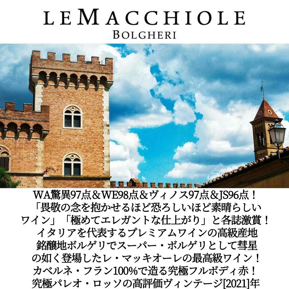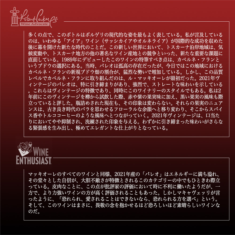 【商品説明】超入手困難!完全割り当て!イタリア辛口フルボディ赤ワイン愛好家大注目! イタリアを代表するプレミアムワインの産地、銘醸地ボルゲリでスーパーボルゲリとして彗星のごとく登場した「レ・マッキオーレ」! あの「メッソリオ」「スクリオ」という世界レベルのワインを生み出し、ボルゲリの気候と台地、そして自身の可能性を信じて造り出した「パレオ・ロッソ」! その最終形態はカベルネ・フラン種100%!オーク樽 (新樽) &?器アンフォラ16ヶ月!さらに瓶熟18ヶ月以上!リリースまで計30ヶ月以上の熟成という驚異の熟成! この2021年でワインアドヴォケイト誌驚異97点でコメントは「多くの点で、このボトルはボルゲリの現代的な姿を最もよく表している。私が言及しているのは、いわゆる「アイア」ワイン(サッシカイアやオルネライア)が国際的な成功を収めた後に幕を開けた新たな時代のことだ。この新しい世界において、トスカーナ沿岸地域は、気候変動や、トスカーナ地方の他の著名なワイン産地との競争といった、新たな重要な課題に直面している。1989年にデビューしたこのワインの特筆すべき点は、カベルネ・フランというブドウの選択にある。当時、パレオは孤高の存在だったが、今日ではこの地域におけるカベルネ・フランの新規ブドウ畑の割合が、猛烈な勢いで増加している。しかし、この品質レベルでカベルネ・フランに取り組んだのは、ル・マッキオーレが最初だった。2021年ヴィンテージのパレオは、特に引き締まりがあり、強烈で、ストレートな味わいを示している。これらはヴィンテージの特徴であり、同時にこのワイナリーのスタイルでもある。私は2年前にこのヴィンテージを樽から試飲した際、赤や紫の果実味に加え、黒い果実の風味も際立っていると評した。瓶詰めされた現在も、その印象は変わらない。それらの果実のニュアンスは、古き良き時代のバラを思わせるフローラルな余韻へと移り変わり、そこからスパイス香やトルココーヒーのような風味へとつながっていく。2021年ヴィンテージは、口当たりにおいてやや抑制され、洗練された印象を与える。わずかに引き締まった味わいがさらなる緊張感を生み出し、極めてエレガントな仕上がりとなっている。」! ワインエンスージアスト誌98点でコメントは「マッキオーレのすべてのワインと同様、2021年産の「パレオ」はエネルギーに満ち溢れ、その堂々とした自信が、大胆不敵さが特徴とされるこのカテゴリーの中でもひときわ際立っている。皮肉なことに、この点が批評家の評価において時に不利に働いたようだが、一方で、より力強いワインの方が高く評価されることもあった。しかしマキャヴェッリが言ったように、「恐れられ、愛されることはできないなら、恐れられる方を選べ」という。そして、このワインはまさに、畏敬の念を抱かせるほど恐ろしいほど素晴らしいワインなのだ。」! ヴィノス97点でコメントは「2021年産のパレオ・ロッソ(カベルネ・フラン)は、高音域のフラン特有の香りがグラスから勢いよく立ち上ります。砕いたような赤系の果実、ブラッドオレンジ、エスプレッソ、モカ、リコリス、そしてエキゾチックなスパイスが口中に広がり、時間とともに高まっていく際立ったテクスチャーの濃密さが感じられます。パレオ・ロッソは通常、瓶内で数年熟成させてから真価を発揮します。このワインも同様になるものと予想されます。ル・マッキオーレによる印象的なワインです。熟成期間は16ヶ月で、主にロー・トーストのフレンチオーク樽で行われ、4%が石器製アンフォラで熟成されています。」! ジェームス・サックリング96点でコメントは「うわぁ。非常に洗練され、上品な味わいで、カシス、スパイス、フレッシュなハーブ、そして杉の香りが、余韻の中で何分間も続く。タンニンは極めて洗練されているが力強さも兼ね備え、骨格と張りがある。熟成させて柔らかくなるのを待つ必要があるが、あらゆる点で非常に本格的な赤ワインだ。ごく一部をアンフォラで熟成。」! チョコレート、濃厚なカシス、エスプレッソと様々なアロマ!濃密でシルキーな舌触り、口に広がる果実味が豊かな素晴らしい品質を誇る、さすがマッキオーレと大納得の傑作赤ワイン!完全割り当ての究極パレオ・ロッソ!高評価ヴィンテージ[2021]年! 究極フルボディ赤ワインが正規代理店輸入品で限定で少量入荷!