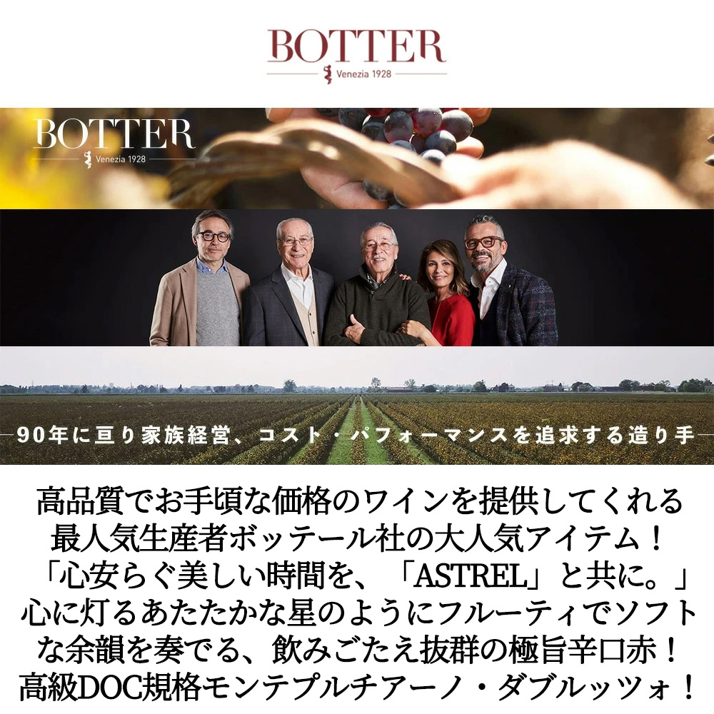 【商品説明】イタリア辛口赤ワイン愛好家大注目! イタリアで生産されている黒ブドウ品種の中でサンジョヴェーゼ種についで2番目に多く栽培されているモンテプルチアーノ種100%! コストパフォーマンスが高く「イタリアワインで高コスパを狙うならモンテプルチアーノ」という消費者も多い、この品種を主体に造られているイタリアの有名ワイン「Montepulciano d’Abruzzo」 (モンテプルチアーノ・ダブルッツォ) は、黒ブドウ品種由来の濃厚さが特徴!コストパフォーマンスが高いため、ワイン初心者から上級者まで幅広く愛されています! しかも法律で原産地が保証されている高級規格のイタリアの保護原産地呼称ワイン! DOC Montepulciano d’Abruzzo (モンテプルチアーノ・ダブルッツォ) の特徴は、タンニンの多さと果実味の豊かさです! イタリアの代表的品種であるサンジョベーゼと比べて酸味は少なめですが、特徴的な香りは甘みのあるブラックベリーやスパイスなどを感じさせます!ずばりアブルッツオ州からコスパ抜群の赤ワインが登場! 「価格」「味わい」「ラベル」3拍子揃った、DOCモンテプルチアーノ・アブルッツオ! 造り手のボッテールはヴェネト州に位置する生産者!ヴェニスから北東に30km程進んだ場所に位置!初代カルロ・ボテール氏は、1928年、バルクワインの卸売業者として“カーザ・ヴィニーコラ・ポテール”を設立!その後2つのエステートを所有!1965年にヨーロッパのマーケットへ進出し、80年代には世界へと販路を拡大!1999年に3世代目のルカ、アンナリザ、アレッサンドロ (三代目) がビジネスに参画!輸出を中心に年々その力を付けてきており現在はアメリカ、イギリス、ドイツを中心に50か国以上にワインを輸出!90年以上に亘る家族経営のワイナリーのため、ブドウの供給農家からの長年の信頼は厚く、高品質のブドウをイタリア各地から入手することが出来ます。醸造や熟成、ボトリングに至るまで一貫して行うため、高品質でお手頃な価格のワインを提供してくれる生産者! このアストレル・モンテプルチアーノ・ダブルッツォは、「忙しい日常から少し離れて、心を解き放ちたいとき。ふと見上げた空に、あるいは心の中に、変わらず輝く星々のきらめきを感じることはありませんか?「ASTREL(アストレル)」は、そんな普遍的な美しい輝きをグラスに閉じ込めたイタリアワイン」!その名は、星を意味する言葉に由来します!深淵な宇宙(そら)を映したような美しいラベルの奥には、イタリアの太陽と大地が育んだ豊かな実りが息づいています!「モンテプルチアーノ」は、心に灯るあたたかな星のようにフルーティでソフトな余韻を奏でます!厳選モンテプルチアーノ100%で造られるこのワインは、深く濃いルビー色に紫の輝きを帯びた、力強い印象の赤ワイン!熟した果実の心地よい香りが広がり、口に含むとドライでまろやか!ソフトなタンニンと程よい酸味がバランスよく調和し、ふくよかな余韻が続きます!モンテプルチアーノらしい豊かな果実味と骨格を楽しめる、飲みごたえ抜群の1本!グラスを傾ければ、そこはあなただけの小さなプラネタリウム。いつもの食卓が、特別な輝きに包まれます。明るい陽射しの下でのランチタイムにも、ゆったりと過ごすディナーにも。心安らぐ美しい時間を、「ASTREL」と共に。パスタ、トマトを使った料理、赤身の肉料理等とも相性抜群です!