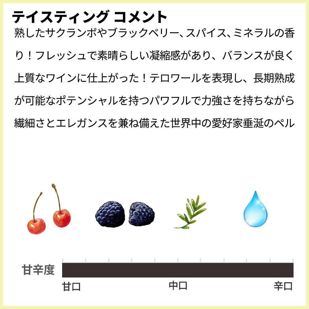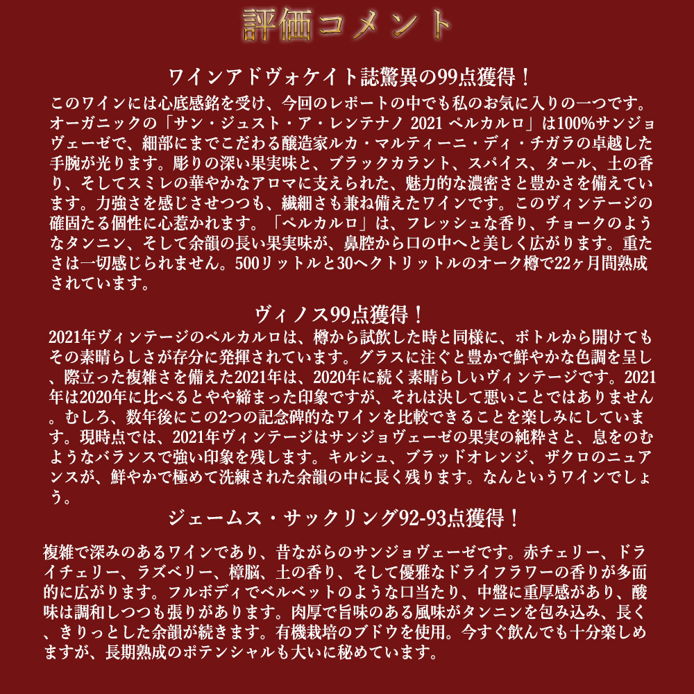 【商品説明】入手困難!高級イタリア・トスカーナ・フルボディ辛口赤ワイン愛好家大注目!しかもサン・ジョヴェーゼ種100%の最高傑作!スーパータスカンファン大注目!トスカーナ・メルロー最高峰「リコルマ」とこのサンジョヴェーゼ100%の名品「ペルカルロ」の成功によって、その名を世界に知らしめたキャンティ・クラシコのトップ生産者のひとり!唯一無二のテロワールから産まれる至極のワイン!サンジュースト・ア・レンテンナーノによる、パワフルで力強さを持ちながら繊細さとエレガンスを兼ね備えた世界中の愛好家垂涎のペルカルロ、まさにそのワイン!他の追随を許さない、サン・ジョヴェーゼの最高傑作! 毎年自身の持つアイデンティティーが表現され、長いボトル熟成によってこのサンジュスト・ア・レンテンナーノの土地をより表現してくれる究極赤ワイン!サンジュスト・ア・レンテンナーノの偉大なスーパートスカン「ペルカルロ」2021年!多くのワイン評論家たちがその濃密かつ気品に満ちた味わいを絶賛! 2021年で、ワインアドヴォケイト誌驚異の99点でコメントは『このワインには心底感銘を受け、今回のレポートの中でも私のお気に入りの一つです。オーガニックの「サン・ジュスト・ア・レンテナノ 2021 ペルカルロ」は100%サンジョヴェーゼで、細部にまでこだわる醸造家ルカ・マルティーニ・ディ・チガラの卓越した手腕が光ります。彫りの深い果実味と、ブラックカラント、スパイス、タール、土の香り、そしてスミレの華やかなアロマに支えられた、魅力的な濃密さと豊かさを備えています。力強さを感じさせつつも、繊細さも兼ね備えたワインです。このヴィンテージの確固たる個性に心惹かれます。「ペルカルロ」は、フレッシュな香り、チョークのようなタンニン、そして余韻の長い果実味が、鼻腔から口の中へと美しく広がります。重たさは一切感じられません。500リットルと30ヘクトリットルのオーク樽で22ヶ月間熟成されています。』! ヴィノス99点でコメントは『2021年ヴィンテージのペルカルロは、樽から試飲した時と同様に、ボトルから開けてもその素晴らしさが存分に発揮されています。グラスに注ぐと豊かで鮮やかな色調を呈し、際立った複雑さを備えた2021年は、2020年に続く素晴らしいヴィンテージです。2021年は2020年に比べるとやや締まった印象ですが、それは決して悪いことではありません。むしろ、数年後にこの2つの記念碑的なワインを比較できることを楽しみにしています。現時点では、2021年ヴィンテージはサンジョヴェーゼの果実の純粋さと、息をのむようなバランスで強い印象を残します。キルシュ、ブラッドオレンジ、ザクロのニュアンスが、鮮やかで極めて洗練された余韻の中に長く残ります。なんというワインでしょう。』! ジェームス・サックリングも97点高評価でコメントは「複雑で深みのあるワインであり、昔ながらのサンジョヴェーゼです。赤チェリー、ドライチェリー、ラズベリー、樟脳、土の香り、そして優雅なドライフラワーの香りが多面的に広がります。フルボディでベルベットのような口当たり、中盤に重厚感があり、酸味は調和しつつも張りがあります。肉厚で旨味のある風味がタンニンを包み込み、長く、きりっとした余韻が続きます。有機栽培のブドウを使用。今すぐ飲んでも十分楽しめますが、長期熟成のポテンシャルも大いに秘めています。」と大注目! まさに毎年自身の持つアイデンティティーが表現され、長いボトル熟成によってこのサンジュスト・ア・レンテンナーノの土地をより表現してくれるワイン!しかもトスカーナ産メルロの最高傑作&最高峰と言われるカステッロ・ディ・アマの「ラッパリータ」とオルネッライアの「マッセート」と並び称されるワイン!特にリコルマは世界中のワイン愛好家にとって毎年このワインの争奪戦が繰り広げられるほどのラ・リコルマで有名なテヌータ・サンジュースト・ア・レンテンナーノの元詰品! 一番良い区画の自社畑のブドウから選別され、1本あたり0.8Kgに制限された収量のブドウから造られる。発酵とマセレーションはエナメルコーティングされたセメントタンクで30 -35日間、フレンチオーク100%のバリック樽100%で22ヶ月間熟成(バリック、トンノーの新樽使用はなく、2年-4年使用のもの)!瓶熟成はさらに15ヶ月の計37ヶ月熟成品! 重心が低く、コンセントレーション高いのですが、根底にある酸やミネラル感により構造が縒れていない緻密さのあるワインとなっています!今からでも十分楽しめますが、長期に渡り楽しめるリゼルヴァクラスのキアンティ・クラシコと言えます!偉大なスーパートスカン「ペルカルロ」2021年! 濃いルビー色!熟したサクランボやブラックベリー、スパイス、ミネラルの香り!フレッシュで素晴らしい凝縮感があり、バランスが良く上質なワインに仕上がった!テロワールを表現し、長期熟成が可能なポテンシャルを持つパワフルで力強さを持ちながら繊細さとエレ