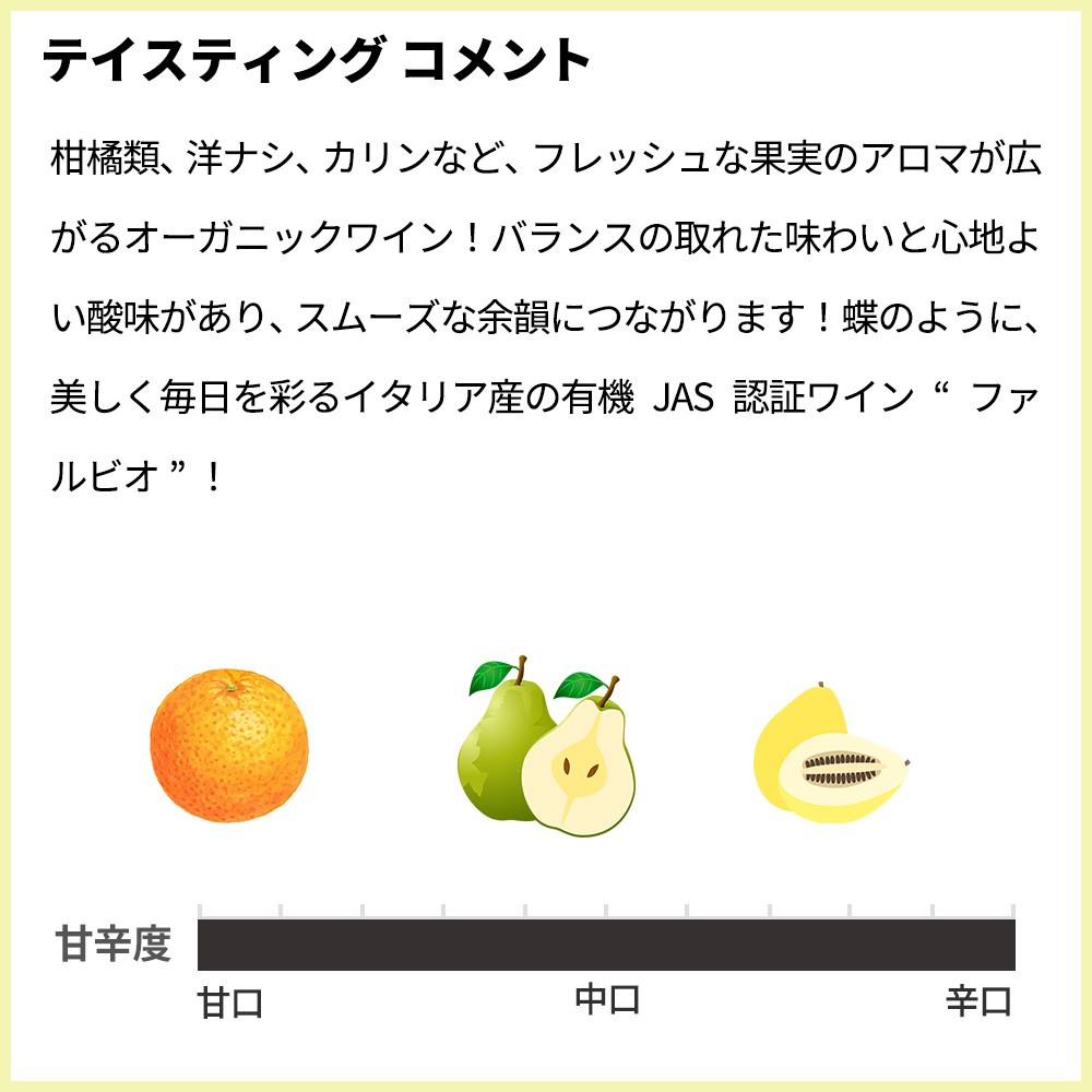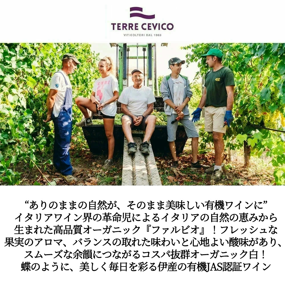 【商品説明】イタリア辛口白ワイン愛好家大注目!オーガニックワイン愛好家大注目!イタリアワイン界の革命児によるイタリアの自然の恵みから生まれた高品質オーガニック『ファルビオ』が遂に登場! “ありのままの自然が、そのまま美味しい有機ワインに”!造り手は今やロマーニャ全域のワインを製造するイタリアを代表する会社となったCE.VICO社!2000年以上もの間、トスカーナとロマーニャの間の、絵画のように美しいアベニン丘陵に広がる葡萄栽培に最適な土地でワインを製造していた生産者たちが、1950年代前半に彼らの経験を集め、共同でワインを造り始めたことに起源を持つ、チェビコ社!現在では、エミリア・ロマーニャのみならずヴェネト、トスカーナやウンブリア地方にまで生産規模を広げています!60以上の国にワインを販売し、イタリア屈指の協同組合に成長!チェヴィコ社のオーガニックワイン! ラベルに描かれた美しい蝶は、イタリアの自然の恵みをたっぷり受けた有機栽培のブドウが優雅で美しいワインへと変化する様子を表現しています! このファルビオ・トレッビアーノ・グレケット・オーガニックは、ビオロジック&ヴィーガン認証のトレッビアーノ75%、グレケット25%をステンレスタンク(オークスティーヴ使用)で醗酵!コンクリートタンク6ヶ月、ステンレスタンク6ヶ月(オークチップ使用)の辛口白ワイン! 柑橘類、洋ナシ、カリンなど、フレッシュな果実のアロマが広がるオーガニックワイン!バランスの取れた味わいと心地よい酸味があり、スムーズな余韻につながります!蝶のように、美しく毎日を彩るイタリア産の有機JAS認証ワイン“ファルビオ”が待望入荷!
