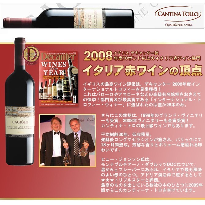 | ■ワインについて | イギリスの最高ワイン評価誌、デキャンター 2008年度インターナショナルトロフィーを見事獲得!イタリア赤ワインの頂点に!これはバローロやアマローネなどの高級有名銘柄をおさえての快挙! ガンベロ・ロッソ誌、ヴェロネッリ誌大注目! 更にヴィニタリー2008金賞受賞! 平均樹齢30年のモンテプルチアーノ100%、しかも超低収穫!発酵後のロングマセラシオン!バリック(小樽)驚異の18ヶ月熟成!芳醇な香りとボリューム感溢れる味わい。カンティナ・トロの最上級フルボディ赤ワイン! |