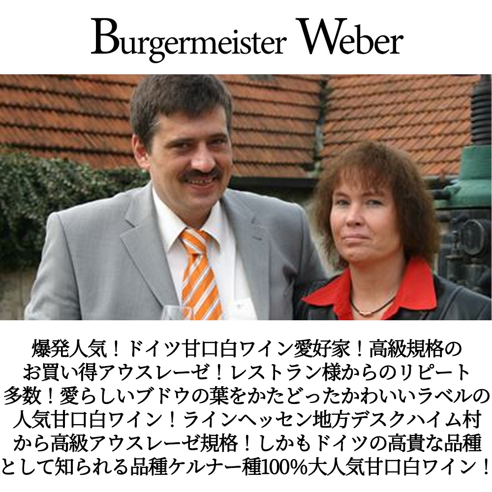 【商品説明】爆発人気!ドイツ甘口白ワイン愛好家大注目!高級規格のお買い得アウスレーゼ!レストラン様からのリピート多数!愛らしいブドウの葉をかたどったかわいいラベルの人気甘口白ワイン! ラインヘッセン地方デスクハイム村から高級アウトレーゼ規格!しかもドイツの高貴な品種として知られる大人気甘口白ワイン用品種ケルナー種100%甘口白(黒ブドウのトロリンガーと白ブドウのリースリングの交配で生まれた品種で、「現代ドイツの葡萄交配の大傑作」とも評されます。香りはリースリング種よりもアロマティックと評され、マスカット、白桃、ミントなどフローラルかつフルーティな香りに味わいはみずみずしく穏やかな酸を持つことでしられています。)のアウトレーゼ! 造り手は18世紀から歴史のある名家であり、親子ともにヴィンツァーマイスター(Winzermeister)(ドイツ語圏で使われる、ブドウ栽培・ワイン造りに関する高度な職業資格/称号。)の資格を持つ家族経営の生産者、ブルガーマイスター・ヴェーバー家(現オーナー ヴェーバー家)! しっかりとした畑と設備から造られるデスクハイムのドクトール「医者」!深みのあるまろやかな甘味、酸もあり、後口の良いアウスレーゼとなっています!美しいロイヤルブルーのボトルに詰められたしっかりとした甘さとコクを持つ人気の甘口白ワインが正規品の蔵出し作品で限定少量入荷!