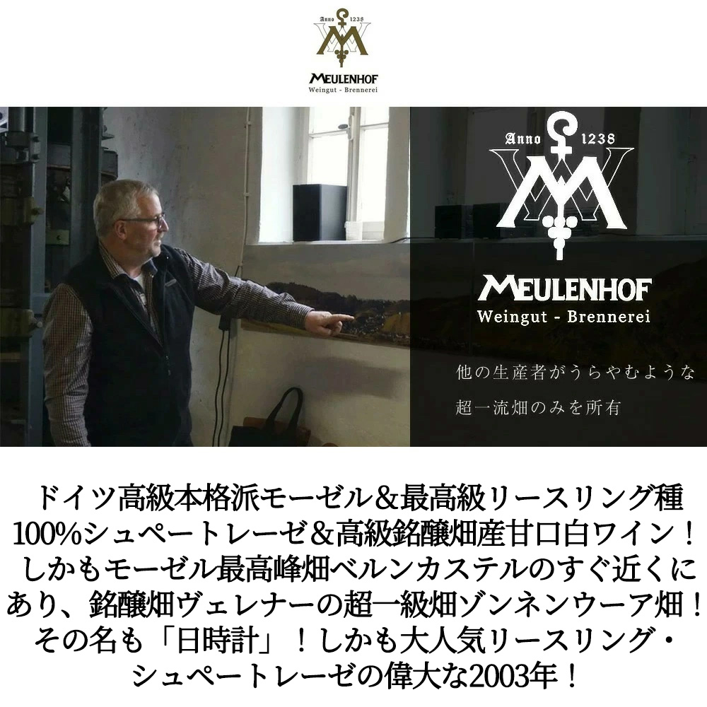 【商品名】ヴェレナー・ゾンネンウーア・リースリング・シュペートレーゼ[2003]年・生産者蔵出し限定秘蔵作品・モイレンホフ(ミューレンホフ)元詰(ステファン・ユステン家)・22年熟成作品(2025年11月正規代理店輸入品)・ゴーミヨ誌3ツ星・リースリング種100%・白・モーゼル・ドイツ【英名】Wehlener Sonnenuhr Riesling Spatlese 2003 Weingut Meulenhof