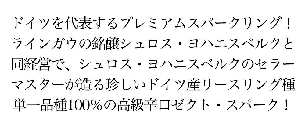 ![]() フュルスト・フォン・メッテルニヒ・リースリング・ゼクト・トロッケン ■葡萄品種:リースリング100% ■残糖度:24g/L ドイツを代表するプレミアムスパークリングワイン(高級ゼクト)! 造り手はあの!ドイツ ラインガウの銘醸シュロス・ヨハニスベルクと同経営であり、シュロス・ヨハニスベルクのセラーマスターが造る高級辛口ゼクト・スパークリング! 「フュルスト」とは“王子”の意味。ウィーン会議当時の侯爵のまだ若き王子であったことに由来しています。ドイツ産ブドウ100%のドイッチャー・ゼクト。単一品種に拘った造りをしています。また、ドイツのプレミアム・スパークリングワイン部門売上シェア*、ブランド認知度ランキング**において1位にランキングされています。 スパークリングワインで20度で3.5bar以上という条件が得られたものだけがこのゼクトを名乗ることができます。 ドイツを代表するプレミアムスパークリングワイン!高級ゼクトが限定で少量入荷! |