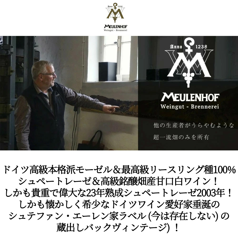 【商品名】エルデナー・トレプヒェン・シュペートレーゼ[2003]年・生産者蔵出し限定秘蔵作品・シュテファン・エーレン家(モイレンホフ・(ミューレンホーフ)(ステファン・ユステン家)元詰)・8.5%・23年熟成作品(懐かしく希少なドイツワイン愛好家垂涎のシュテファン・エーレン家ラベル(今は存在しない)の蔵出しバックヴィンテージ)(2025年11月正規代理店輸入品)【英名】Erdener Treppchen Riesling Spatlese 2003 Weingut Meulenhof (Stephan Ehlen )